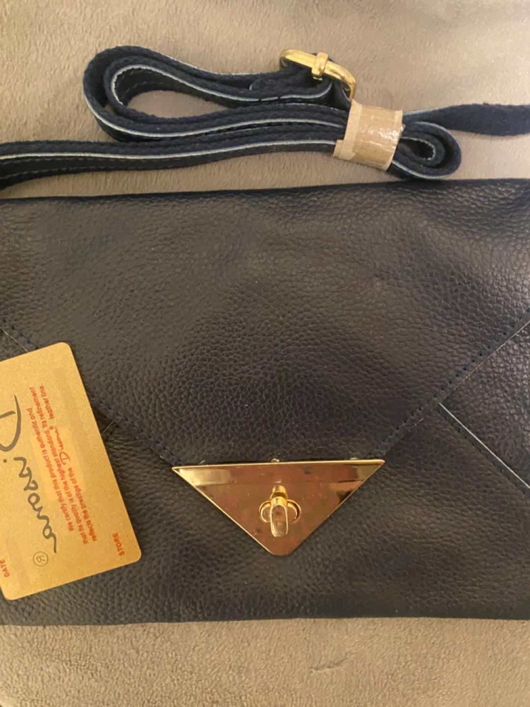 This navy leather shoulder bag from Dissona features a gold-tone clasp closure. It's made with high-quality leather, reflecting the brand's prestige. It comes with an adjustable strap.