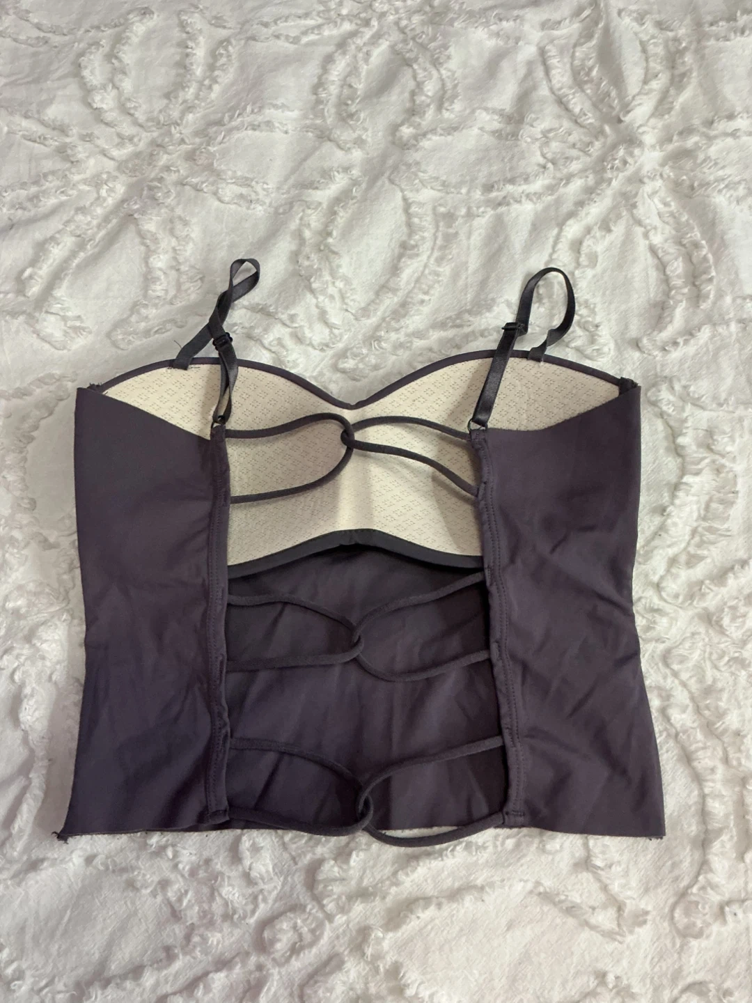 This is a grey bralette top with adjustable straps. It features a strappy detail on the back for a stylish look. The fabric is soft and comfortable. Wore just once.
