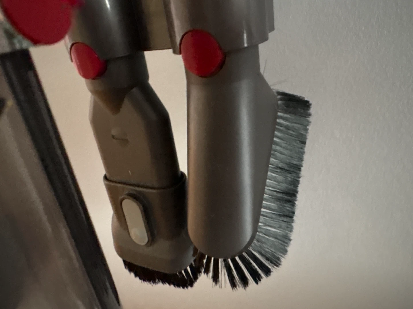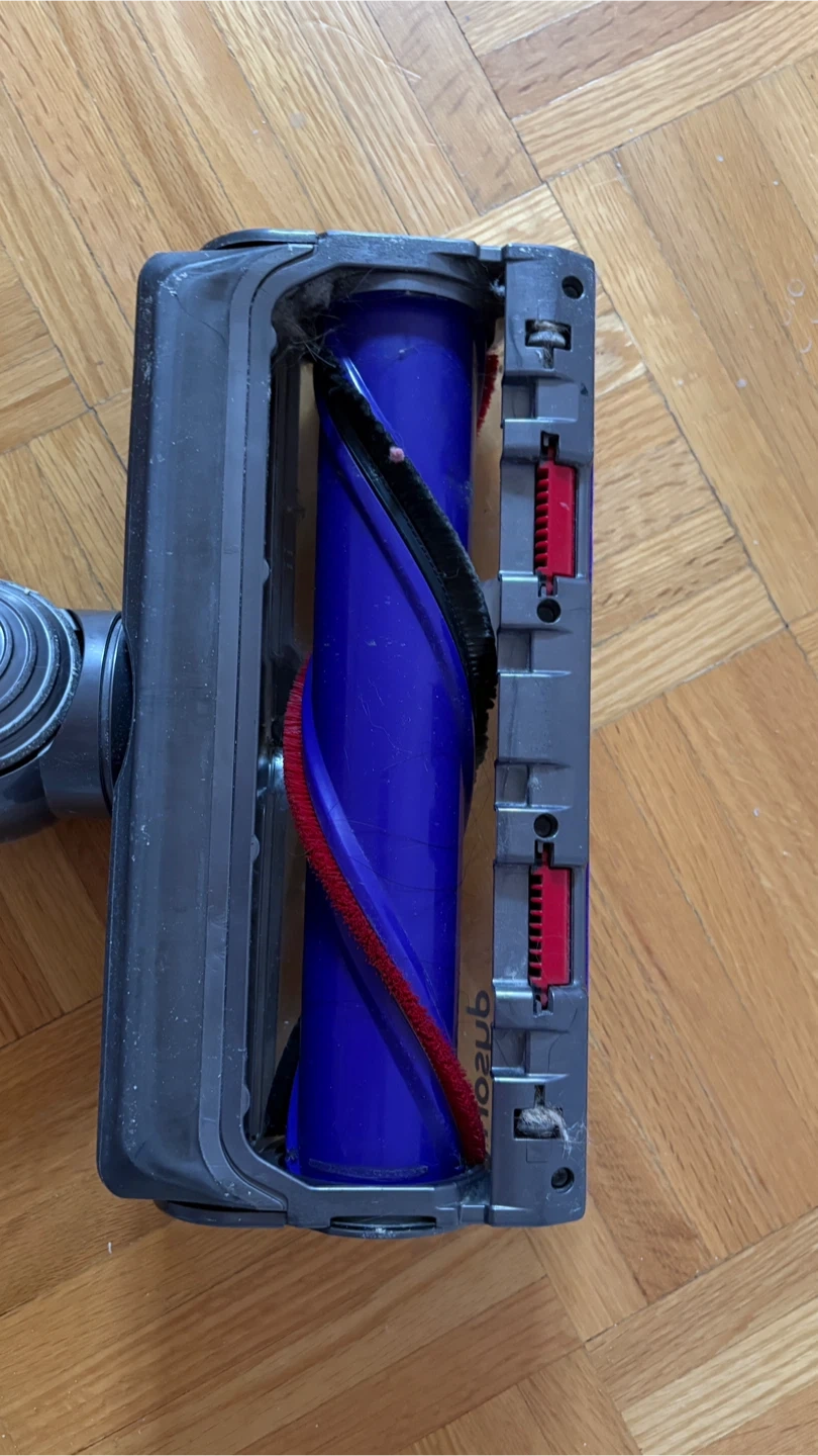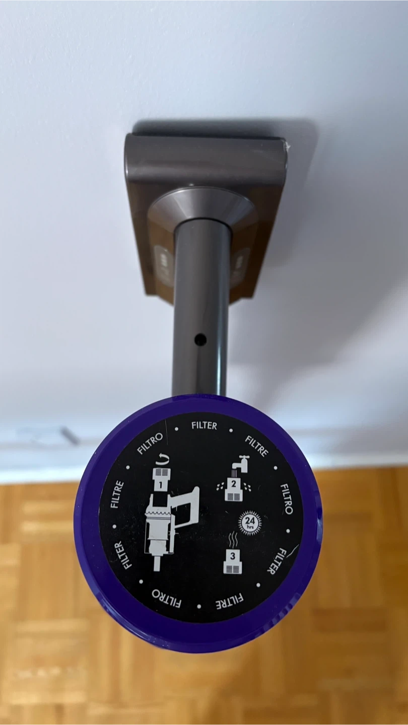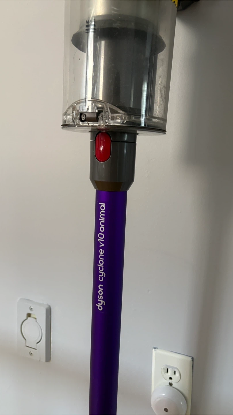Dyson Cyclone V10 Animal cordless vacuum. It's powered by a digital motor for strong suction. Features a clear bin for easy dirt visibility. Wall mounting charger and 4 extra attachments.