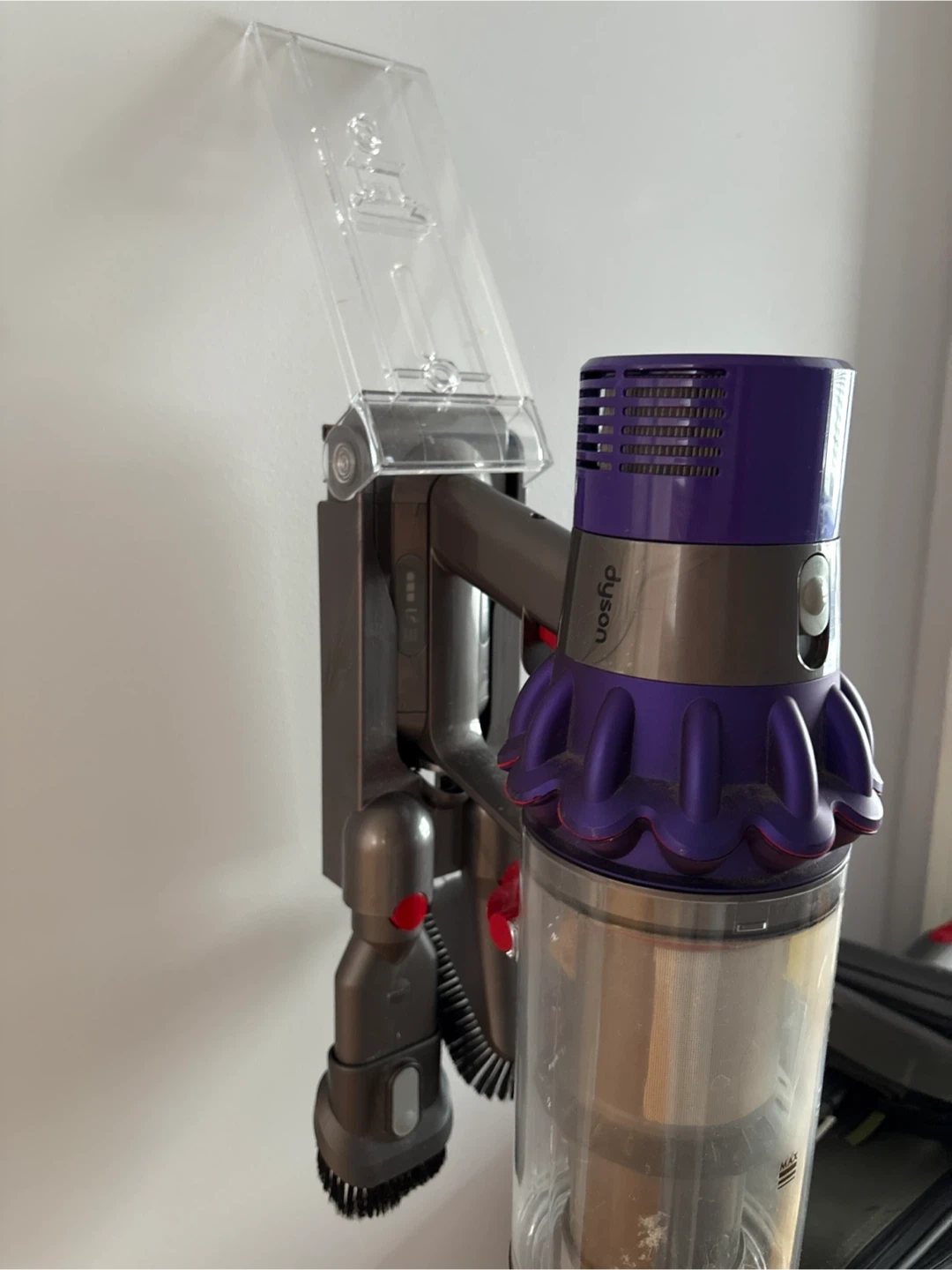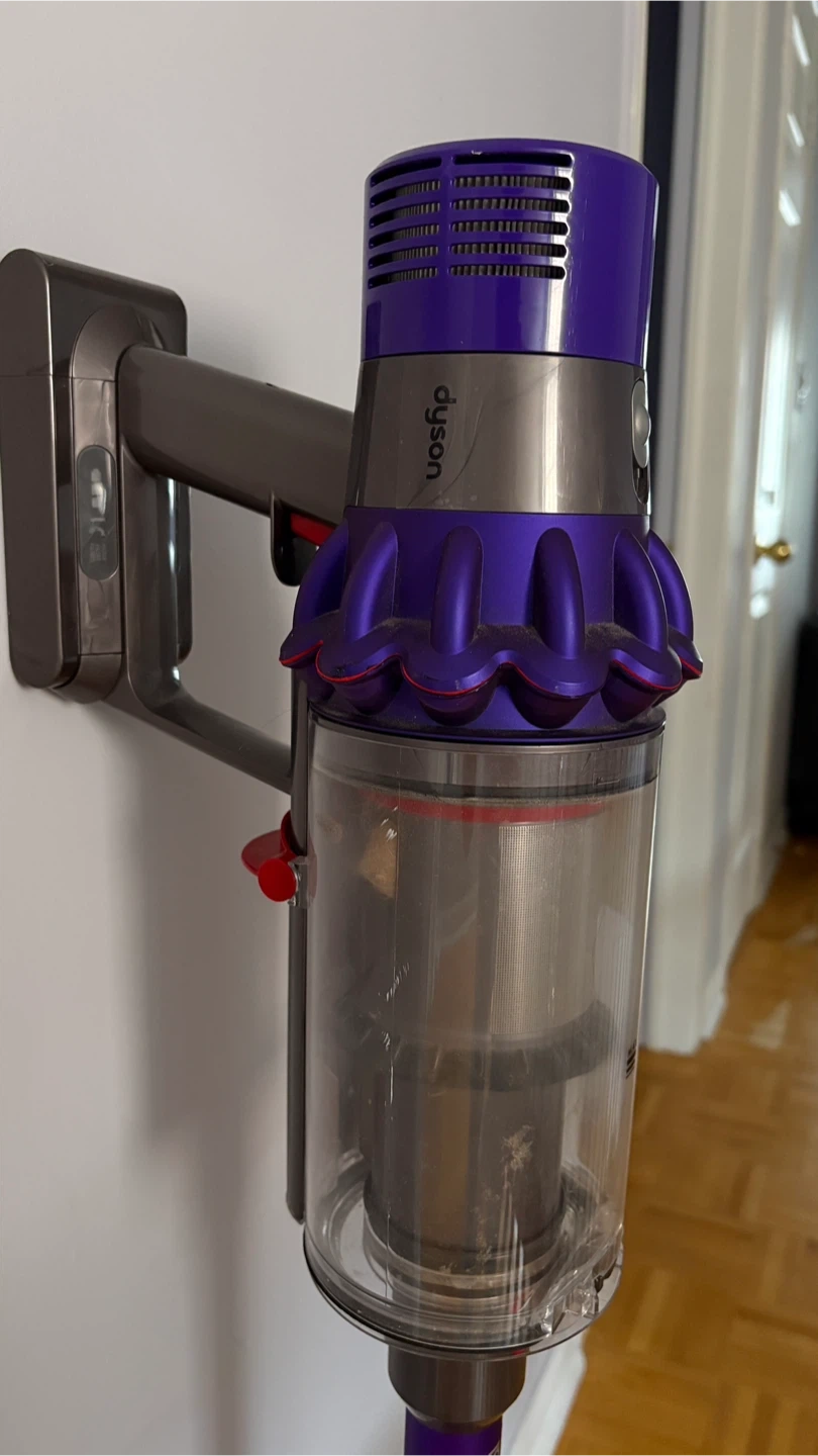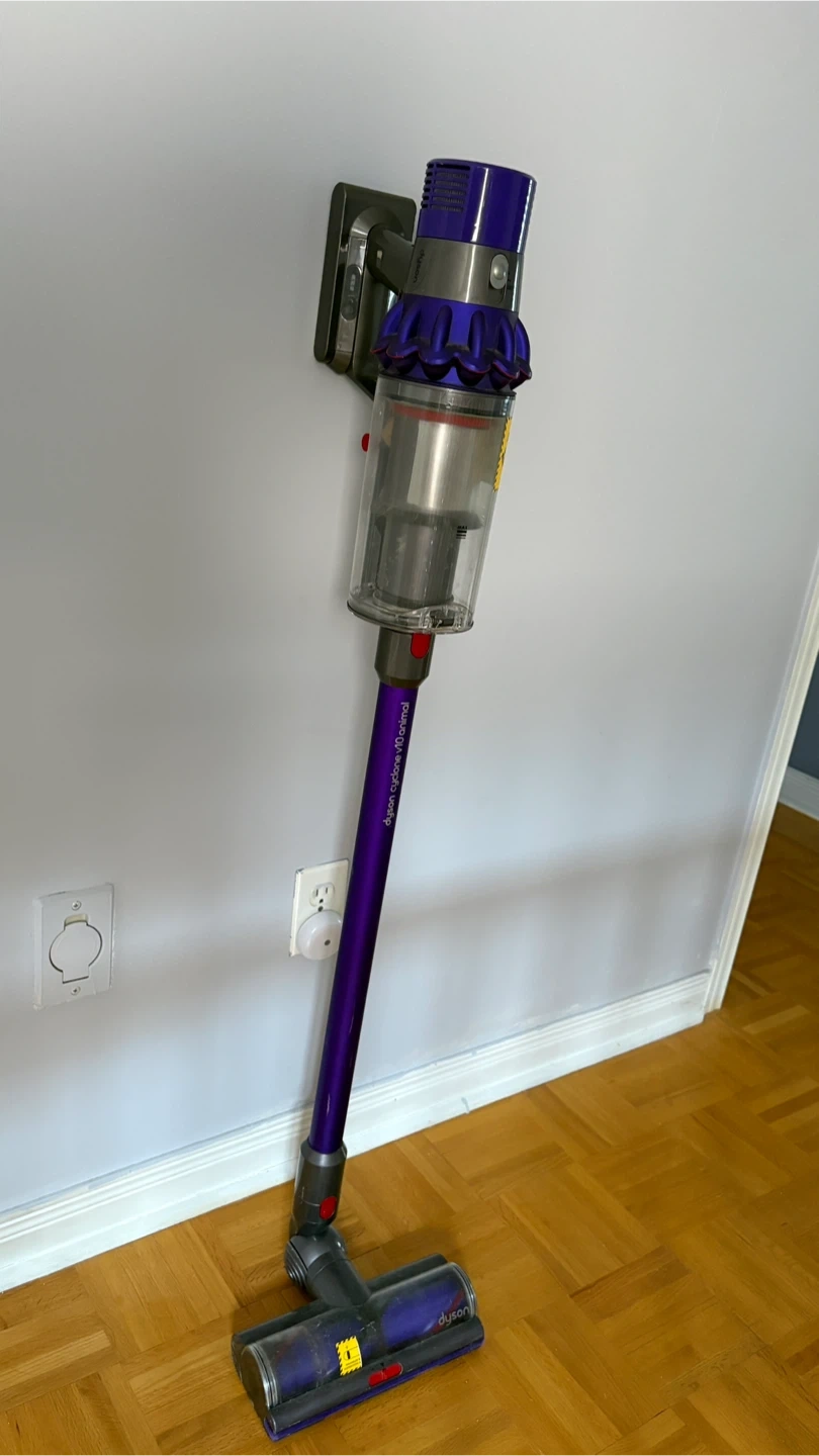 Dyson Cyclone V10 Animal cordless vacuum. It's powered by a digital motor for strong suction. Features a clear bin for easy dirt visibility. Wall mounting charger and 4 extra attachments.