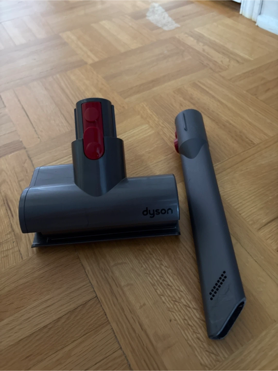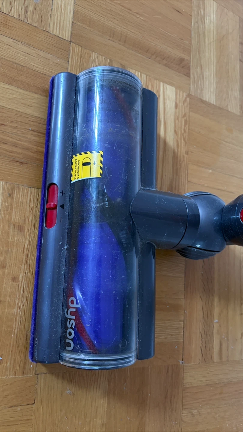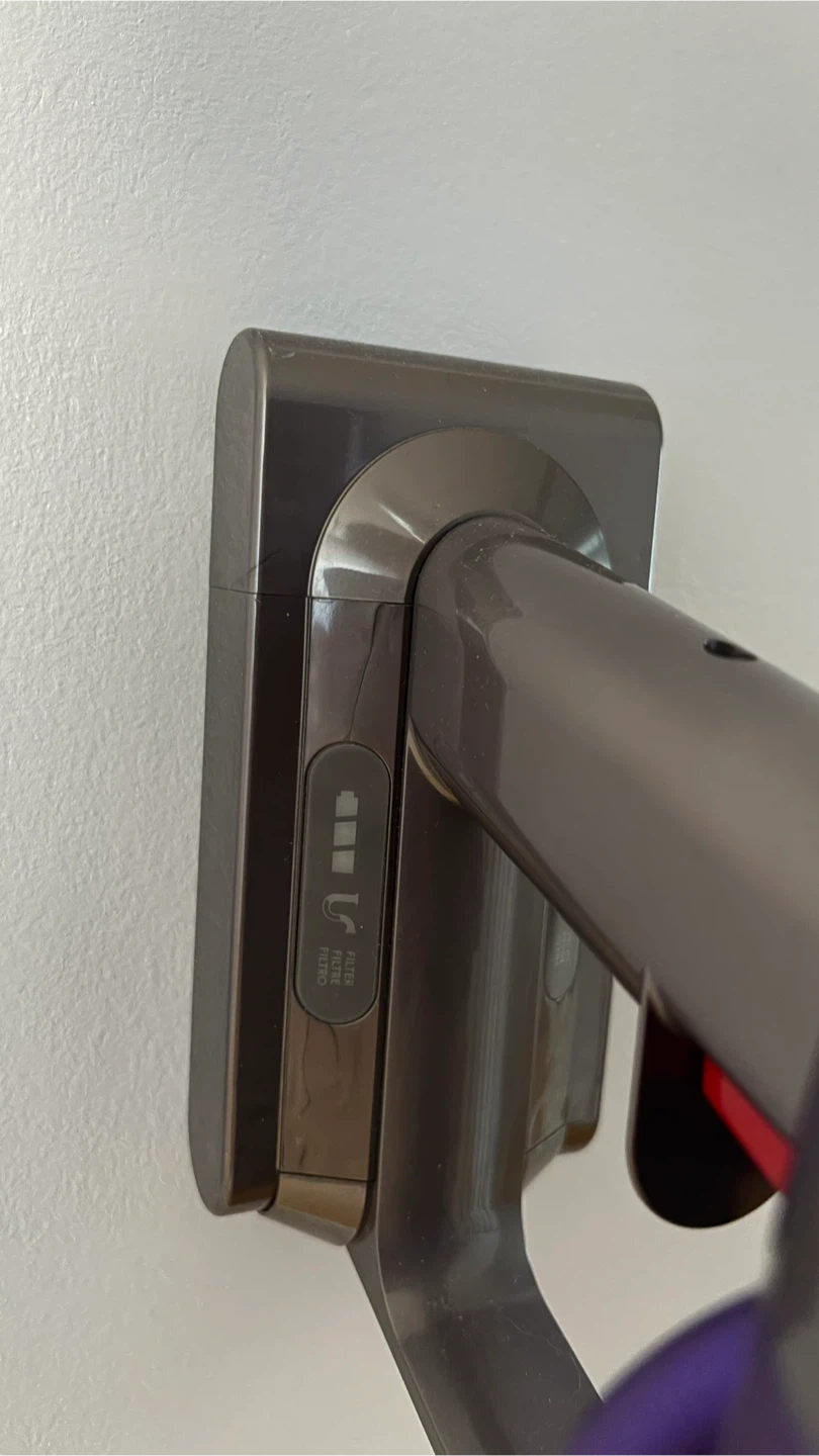 Dyson Cyclone V10 Animal cordless vacuum. It's powered by a digital motor for strong suction. Features a clear bin for easy dirt visibility. Wall mounting charger and 4 extra attachments.