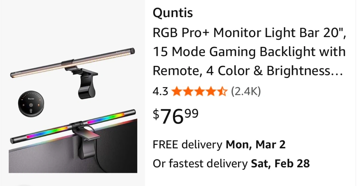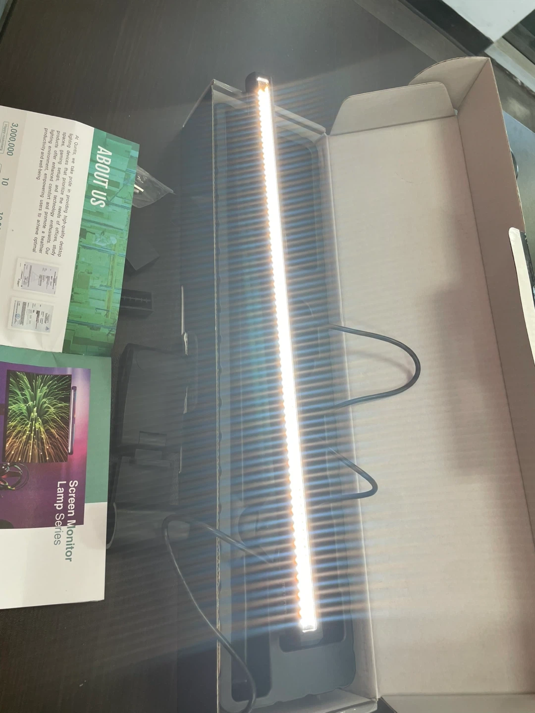 This is a monitor light bar, 20 inches in length. It includes a remote for 15 modes and 4 color options. Brightness is adjustable.