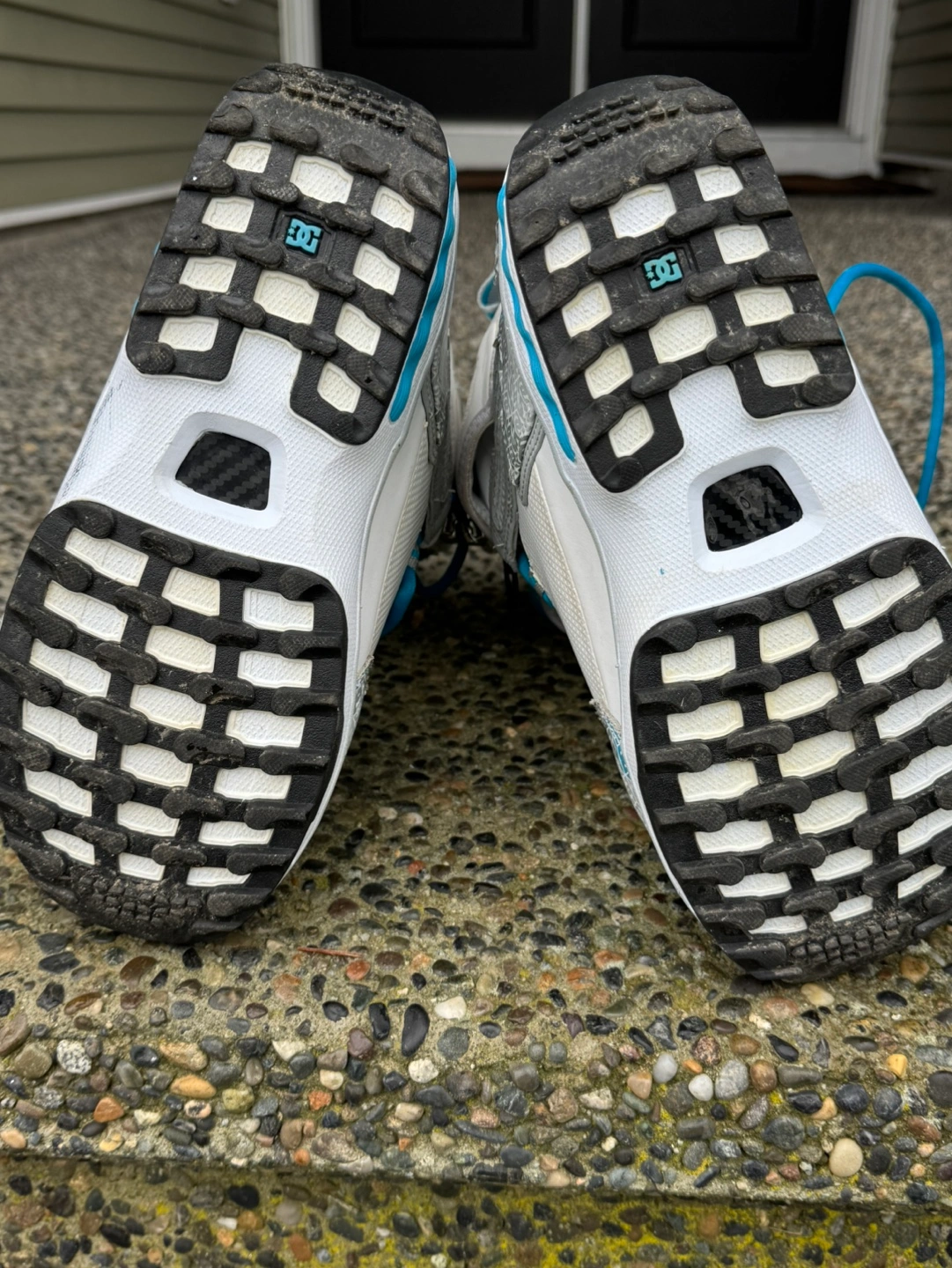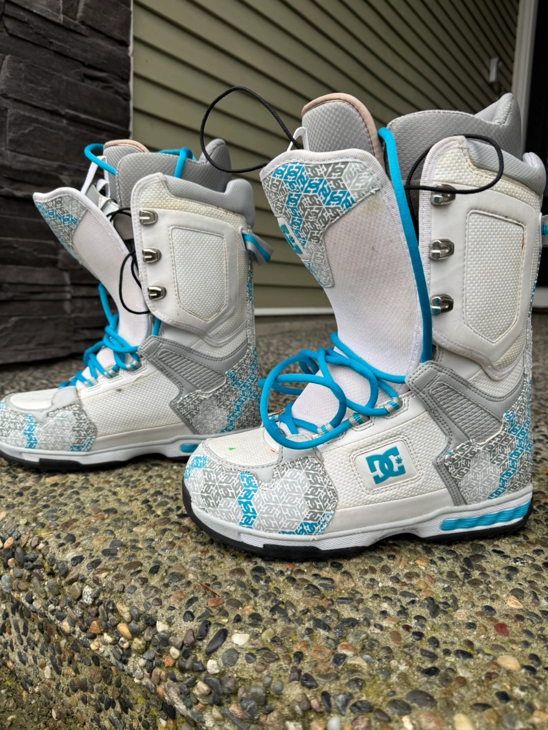 246Women's DC Shoes snowboard boots. Size 9 US, 7 UK, 40.5 EUR. White, grey, and teal. Synthetic upper, rubber outsole.