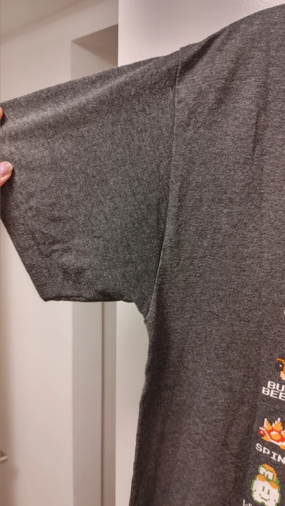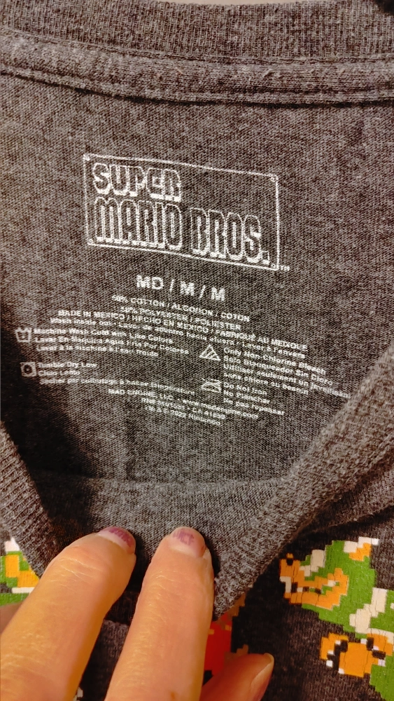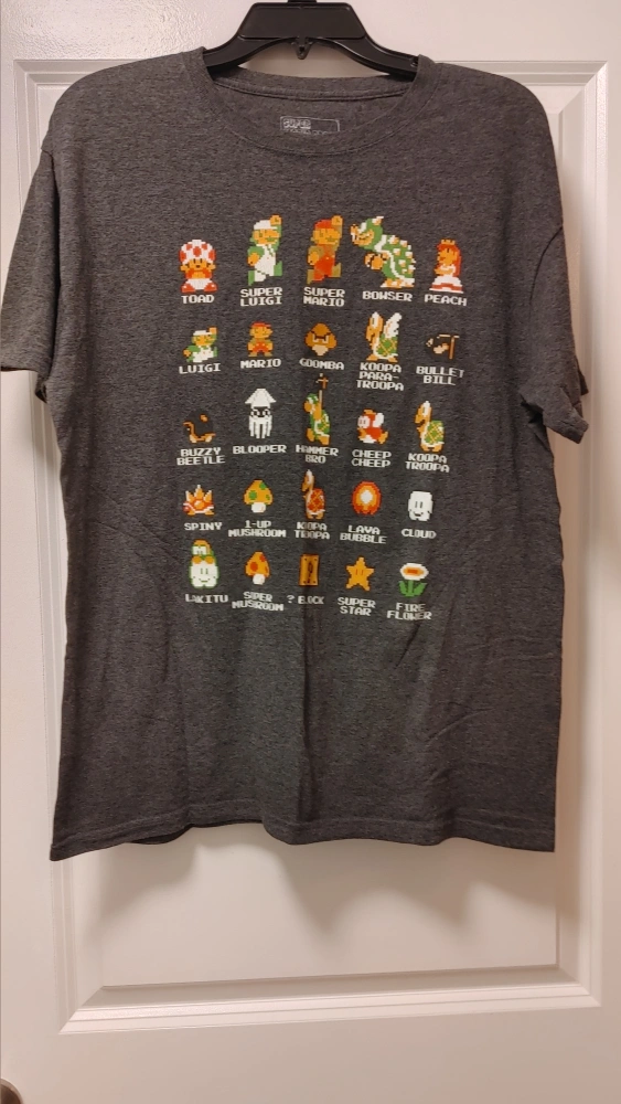 Grey t-shirt with a Super Mario Bros. character graphic print. Made of 60% cotton and 40% polyester. Size medium.