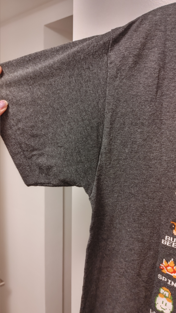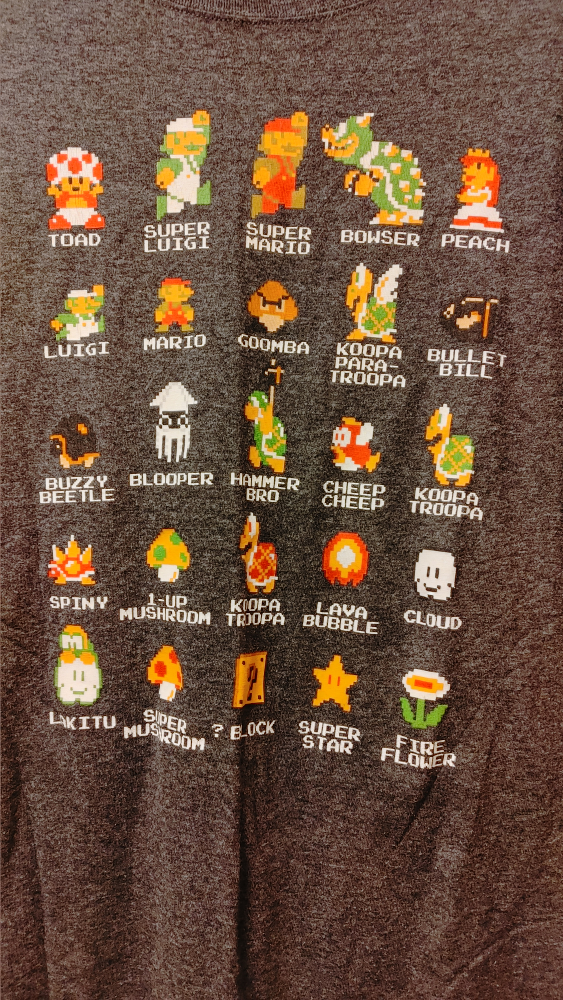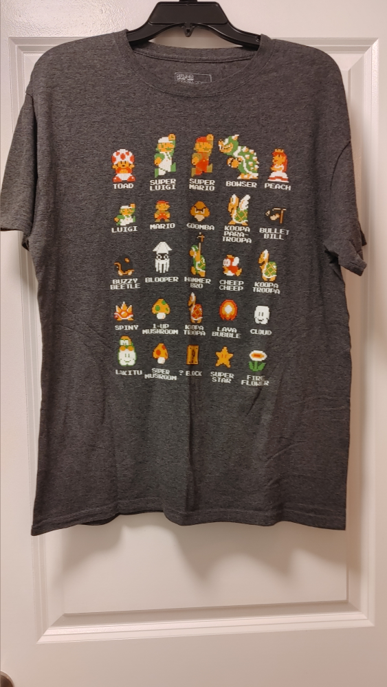 Grey t-shirt with a Super Mario Bros. character graphic print. Made of 60% cotton and 40% polyester. Size medium.
