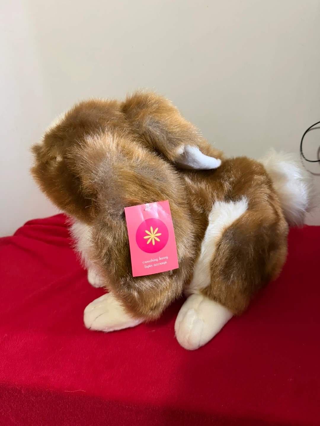 This is a soft, brown and white crouching bunny plush toy. It's made with fluffy material and has floppy ears. This plush toy is great for kids or as a decorative item!
