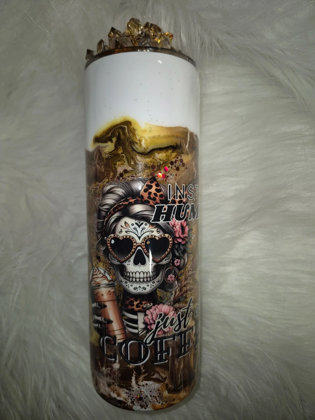 This is a custom 20 oz tumbler with a "Instant Human Just Add Coffee" design. It features a skull graphic and decorative elements. The tumbler is topped with decorative ice. It's perfect for keeping your beverages hot or cold.