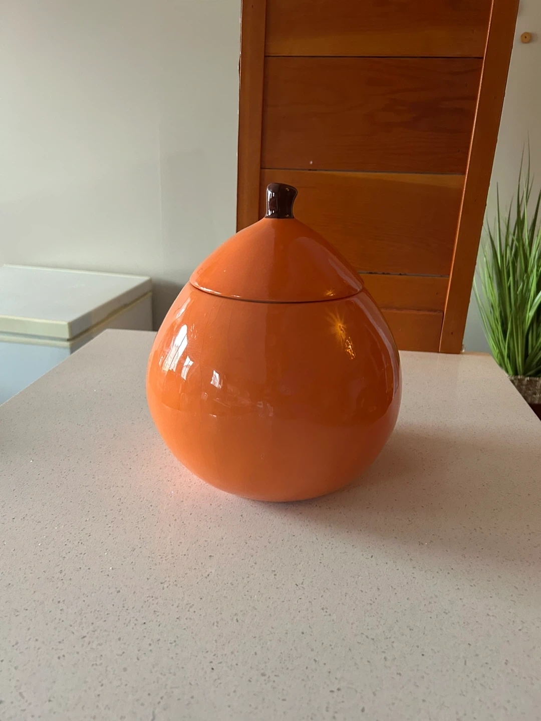 This festive ceramic jar is shaped like a pumpkin and comes with a lid. It's perfect for storing Halloween treats or as a seasonal decoration. It's made of ceramic material.
