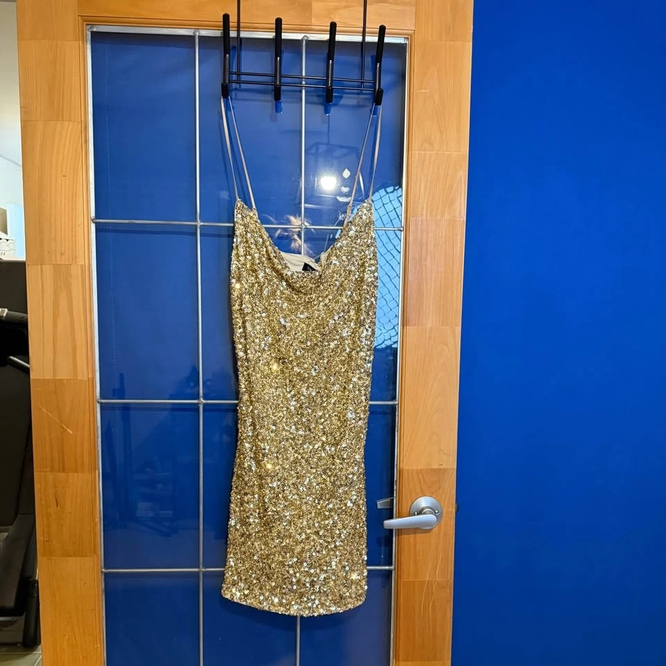 Gorgeous Dani Sequins Dress from Dynamite in the gold “Sandshell” color. Worn once to the Eras tour, in excellent condition. Super flattering slip-style fit. Perfect for New Year’s Eve, holiday parties, birthdays, or bachelorettes. Pickup in Abbotsford – Mount Lehman area.