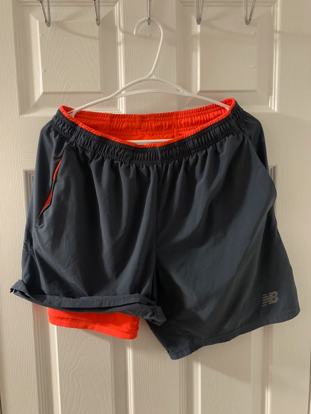 New Balance running shorts in excellent condition! These shorts are grey with an orange lining. Perfect for running or other athletic activities
