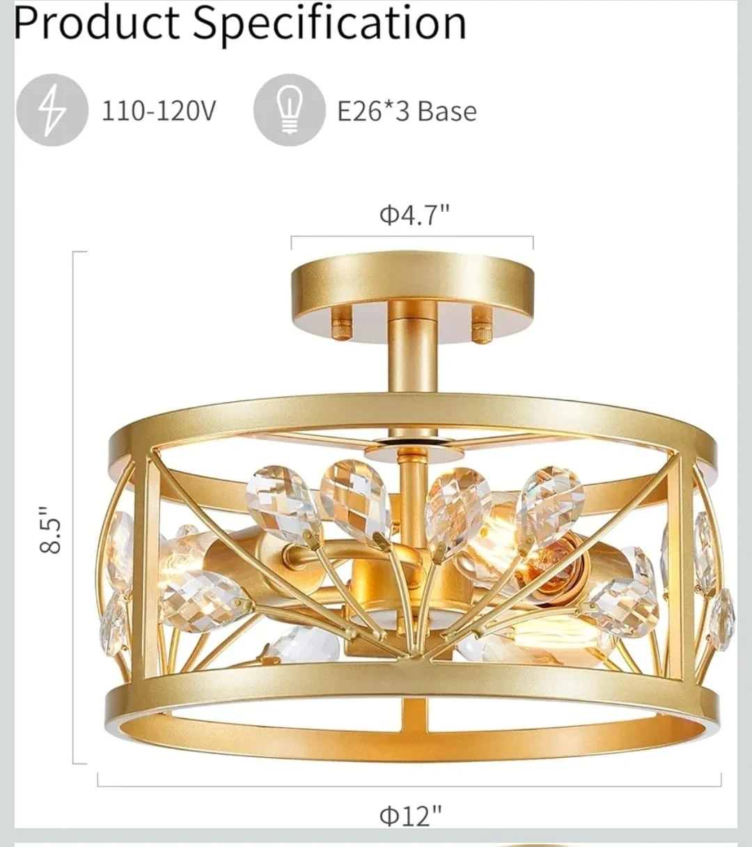 Elegant gold flush mount ceiling light fixture. It features crystal accents and a metal drum shade. This light uses an E26 base and requires 3 bulbs. Dimensions are 12" diameter and 8.5" height.