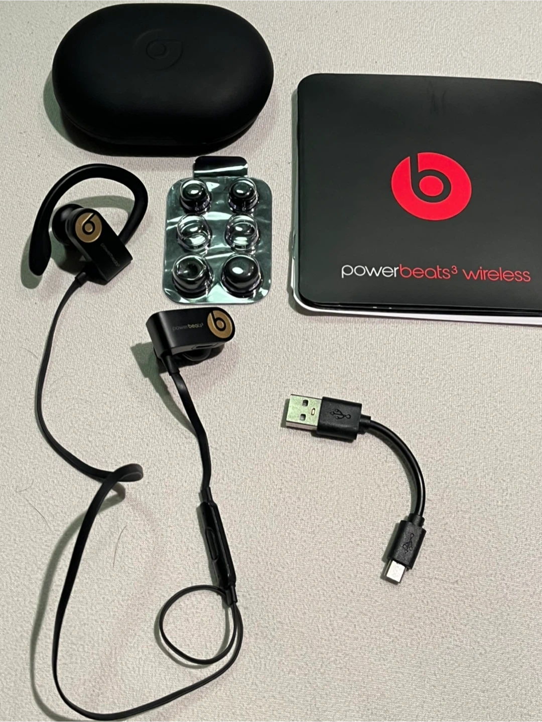 Beats Powerbeats3 Wireless earphones in black. Includes case, cable, and multiple ear tip sizes. One of ear hooks is broken but they still work well. Box and documents included.