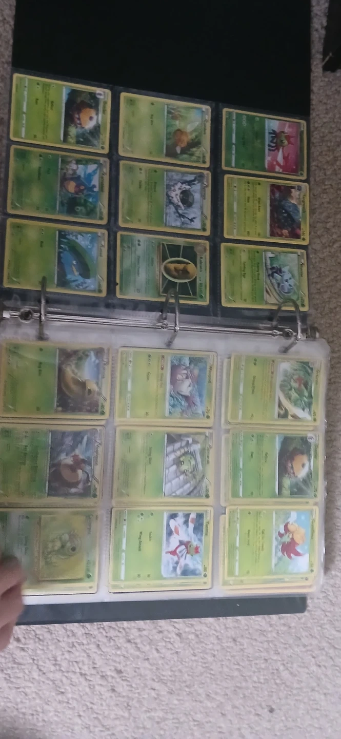 This is a Pokémon card binder full of various cards. It's a black binder with a "Train On" sticker on the front. Holds many cards!