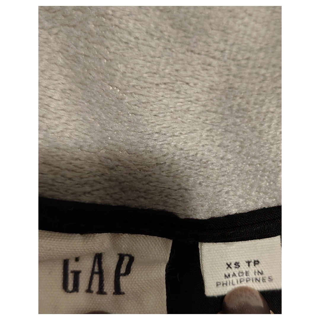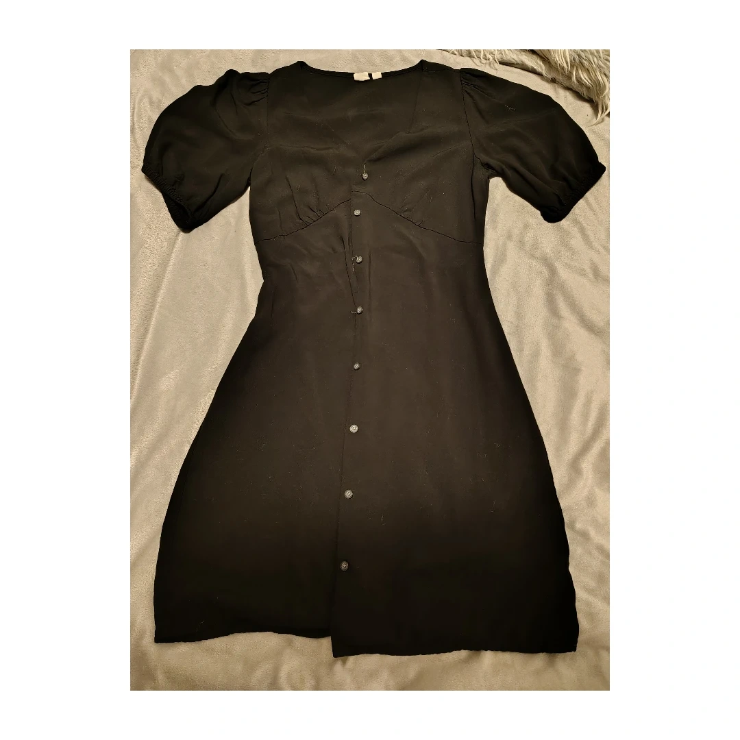 This is a black puff sleeve dress from GAP. It features a button-front closure and short, puffed sleeves. The fabric is lightweight and suitable for warmer weather. Size is XS. Linen blend