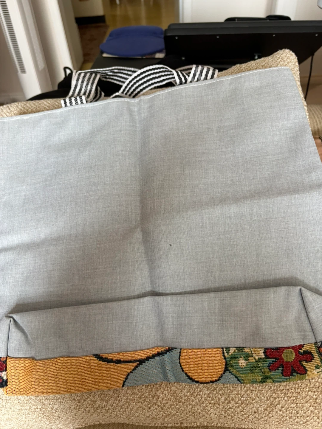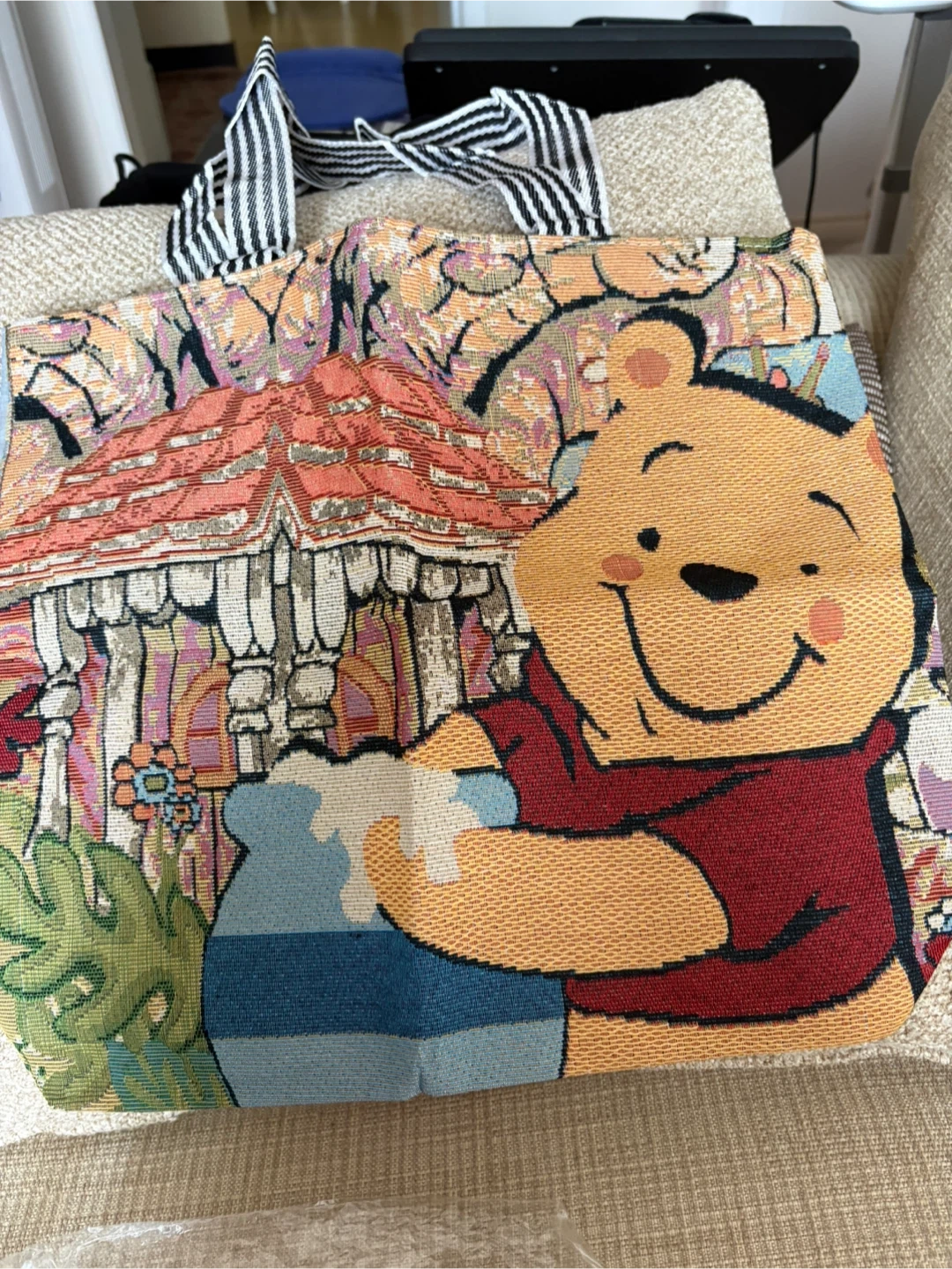 Cute tapestry tote bag featuring Winnie the Pooh and a house design. It has a fabric lining and black and white striped shoulder straps. This bag is great for carrying everyday essentials!
