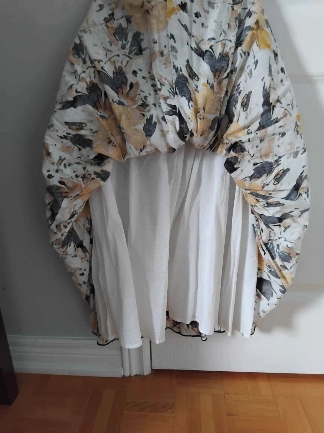 This is a beautiful Kenar maxi skirt with a floral pattern! It has a black elastic waistband that can fold over and a white lining. It's in great condition and perfect for summer