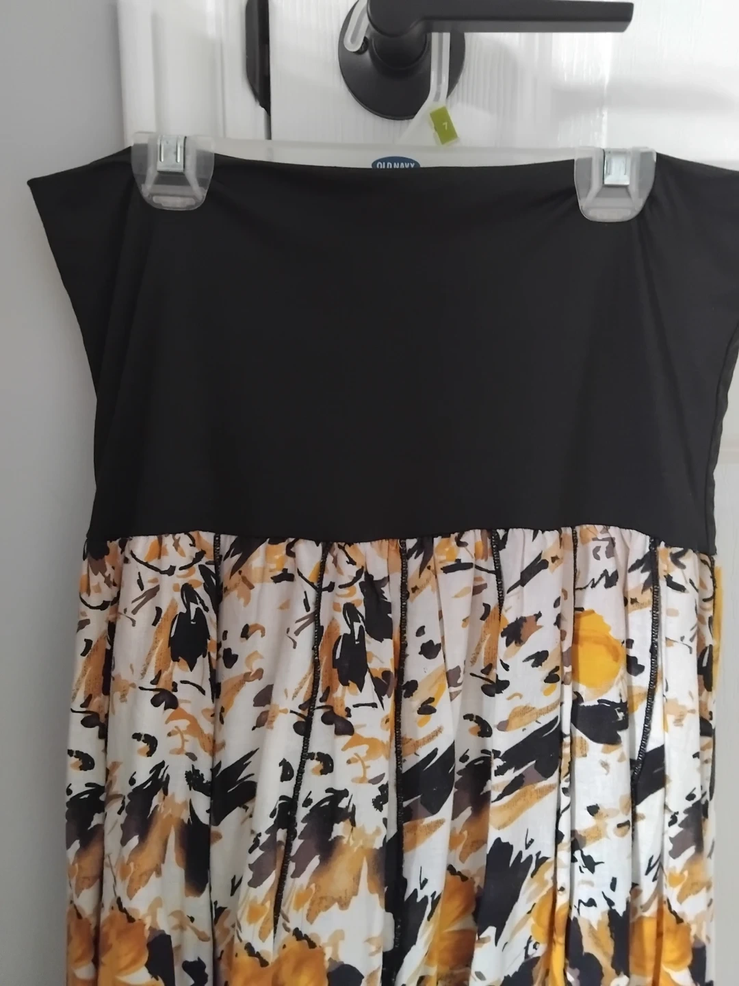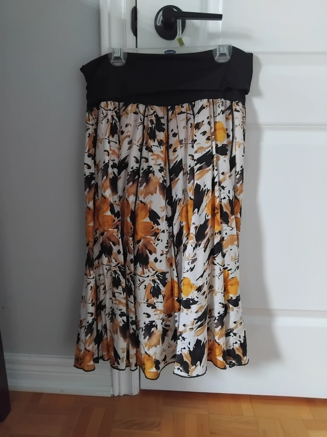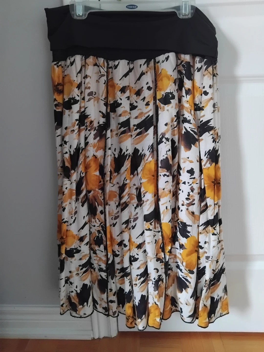 This is a beautiful Kenar maxi skirt with a floral pattern! It has a black elastic waistband that can fold over and a white lining. It's in great condition and perfect for summer