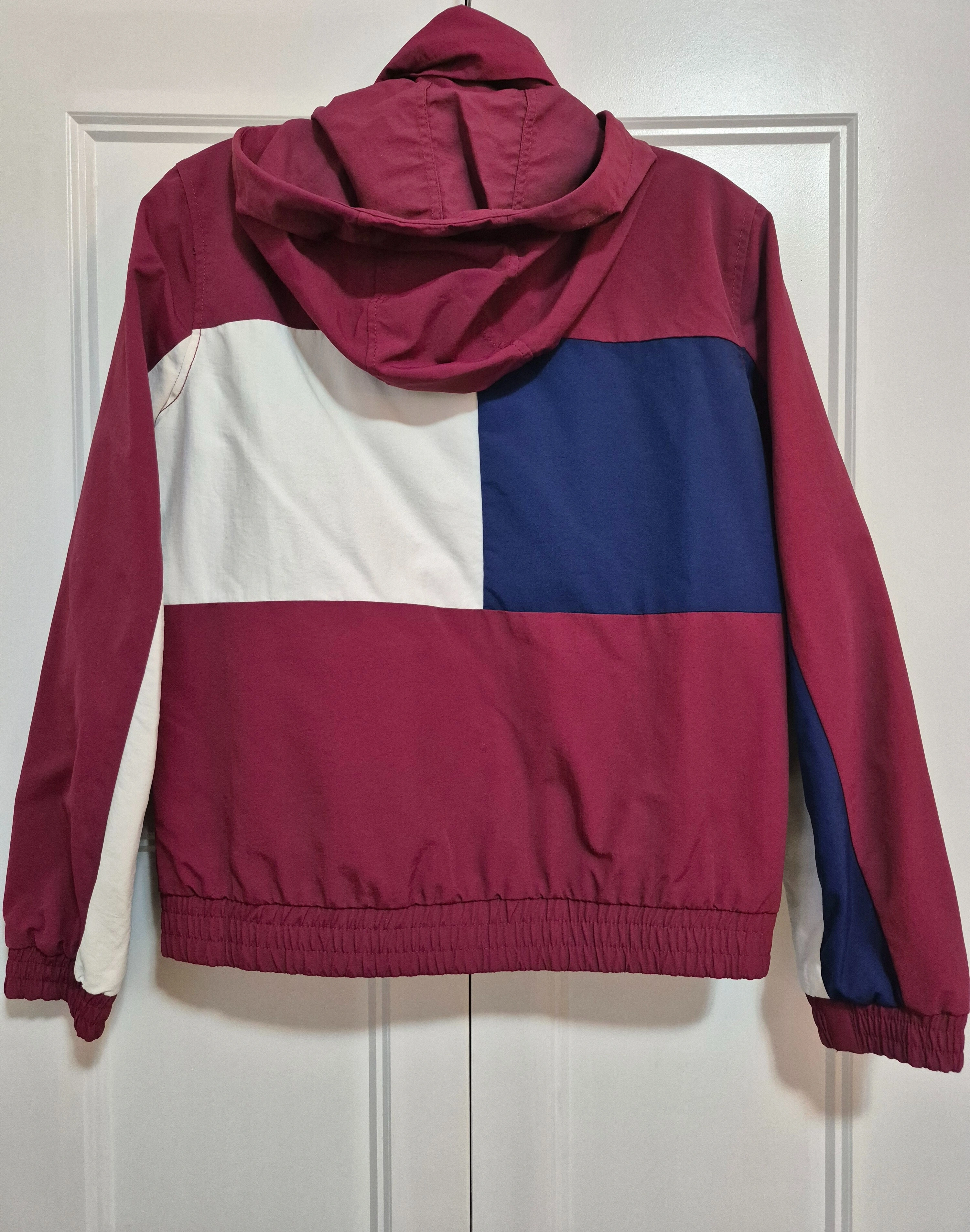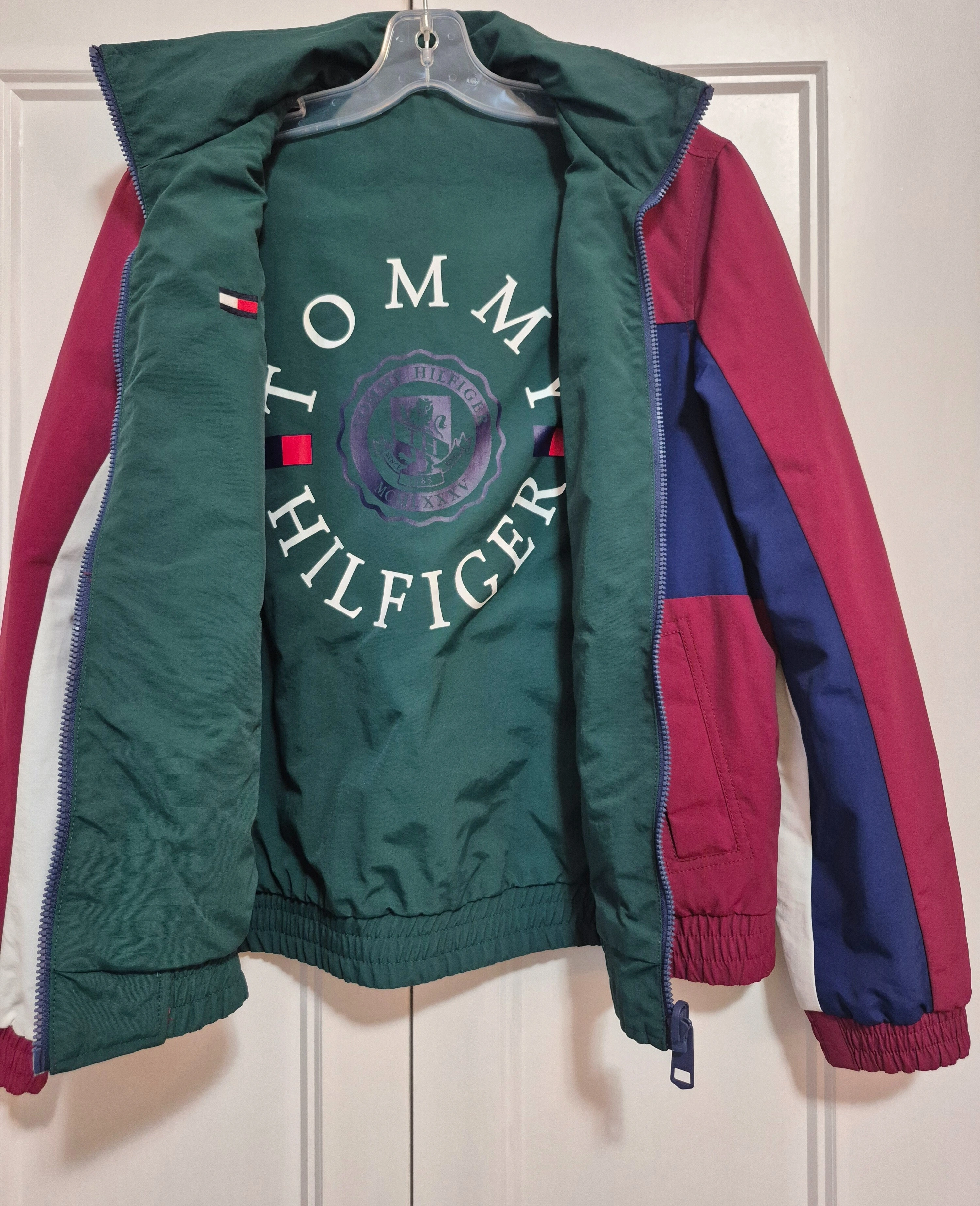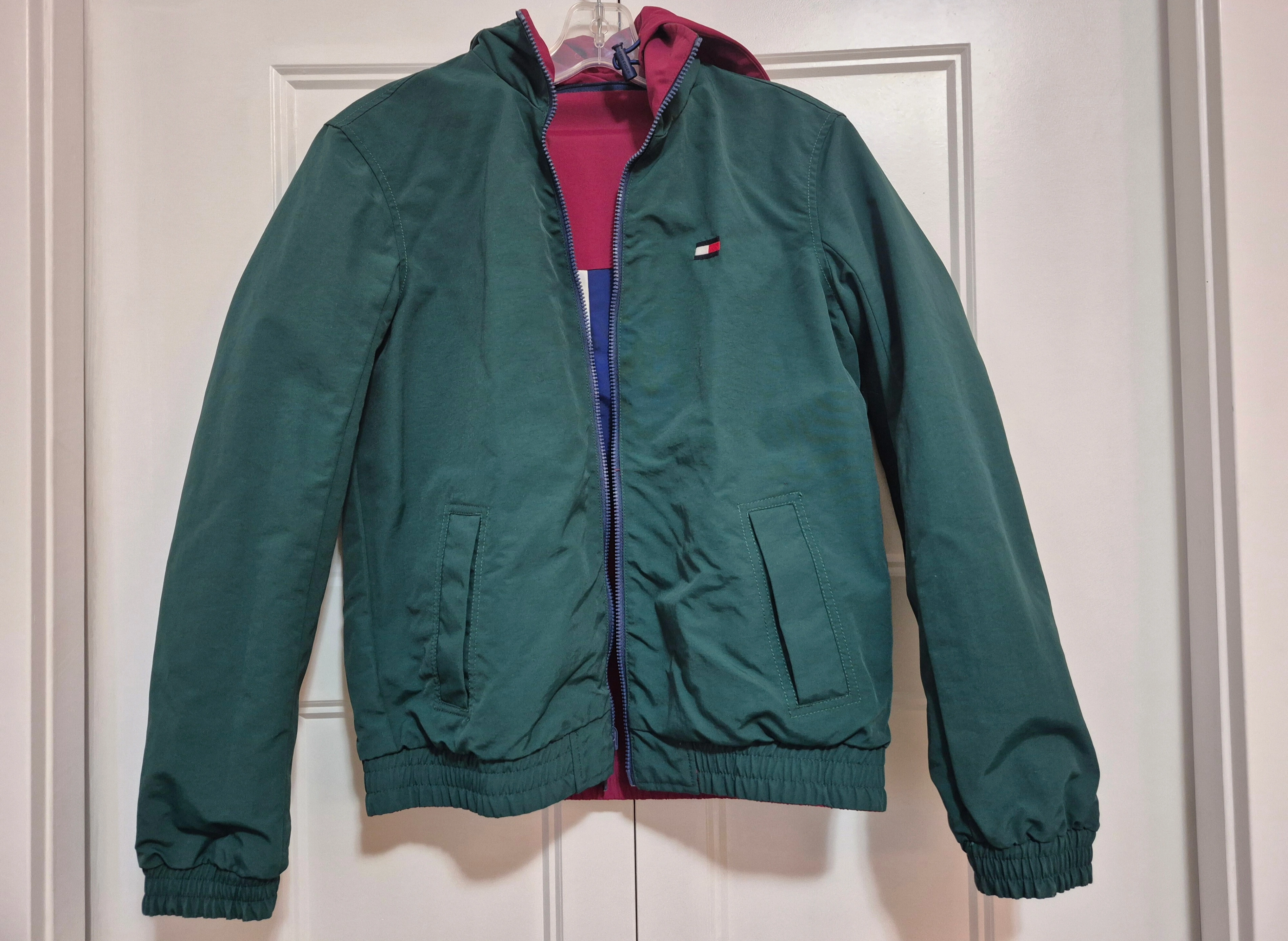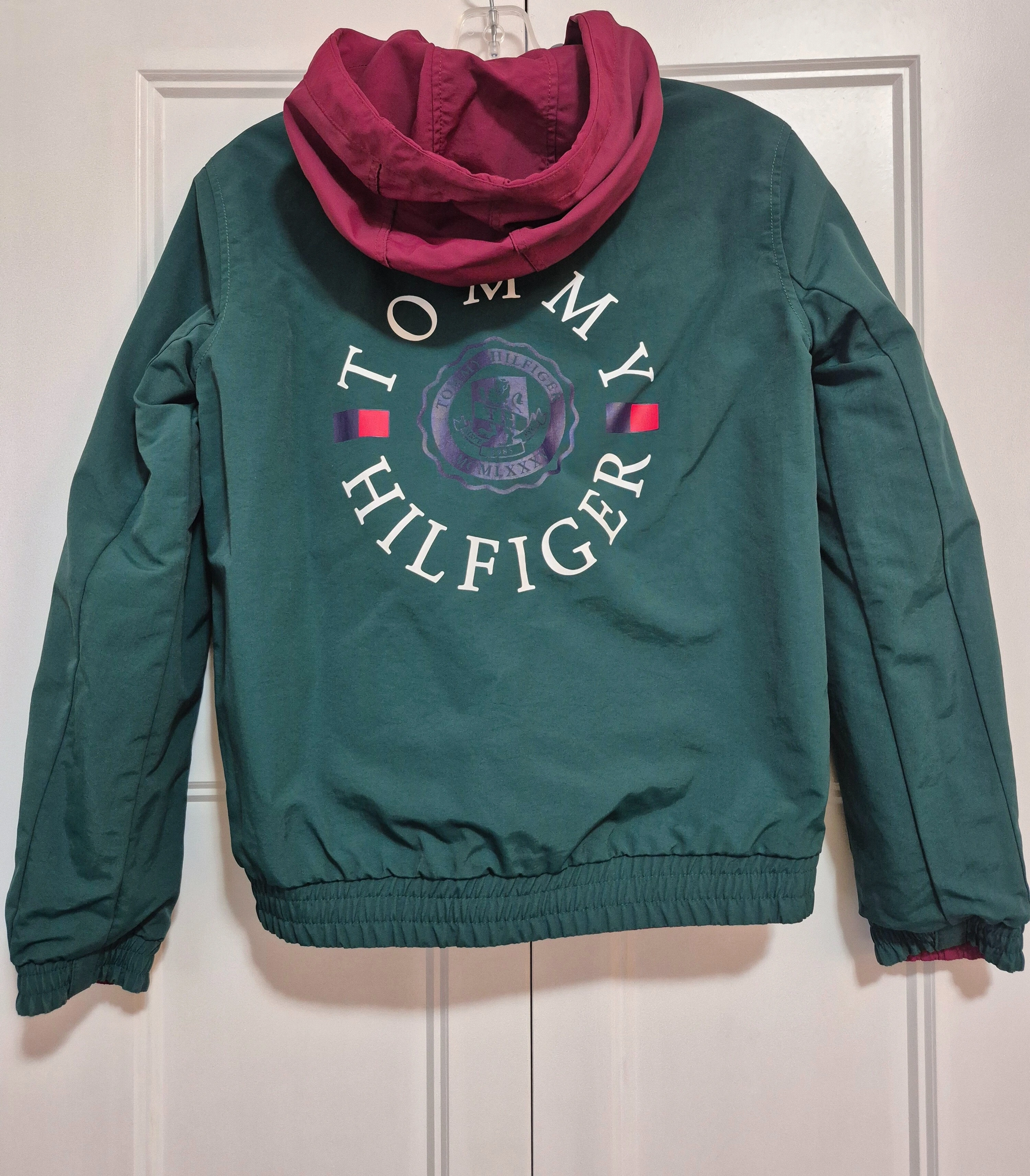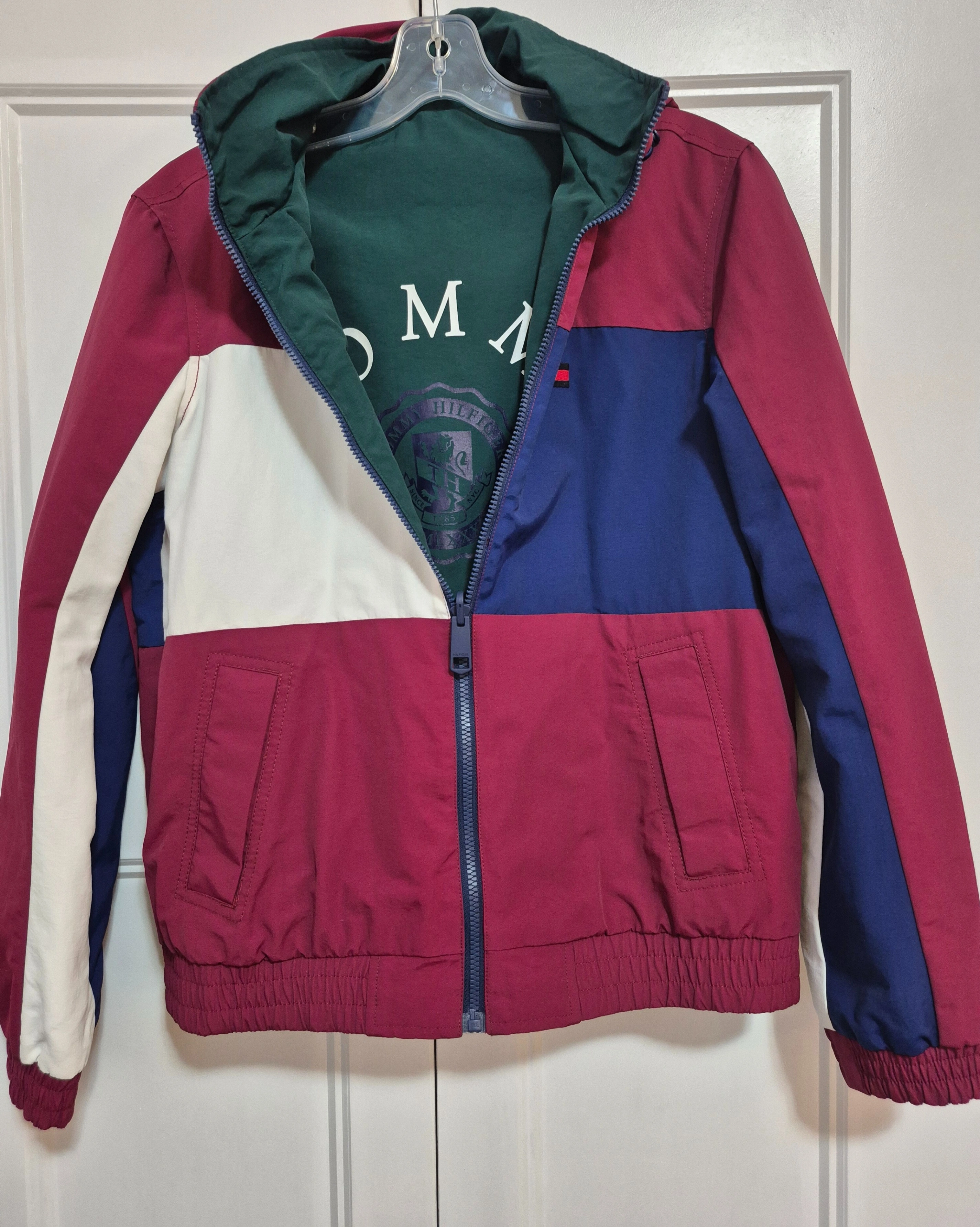 Tommy Hilfiger reversible jacket with a hood. One side is maroon, white, and blue, while the other side is green. It's in great condition!
