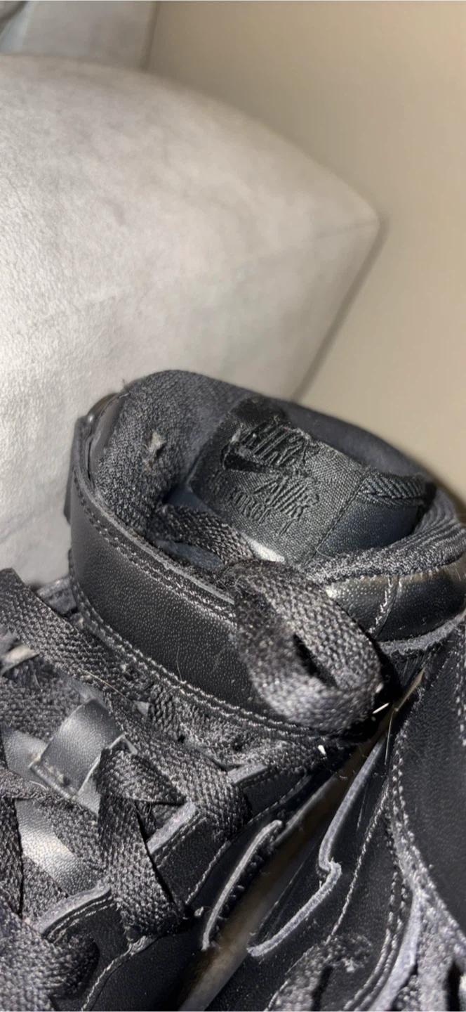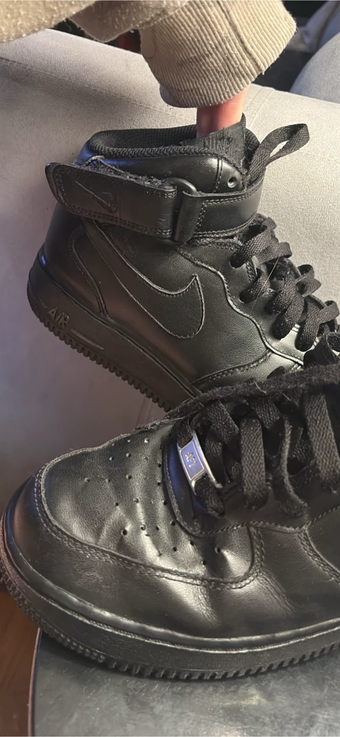These are a pair of black Nike Air Force 1 Mid ‘07 top sneakers. They're made of leather with a rubber sole. These sneakers are great for everyday wear. will be cleaned + new laces. (Men’s 8.)