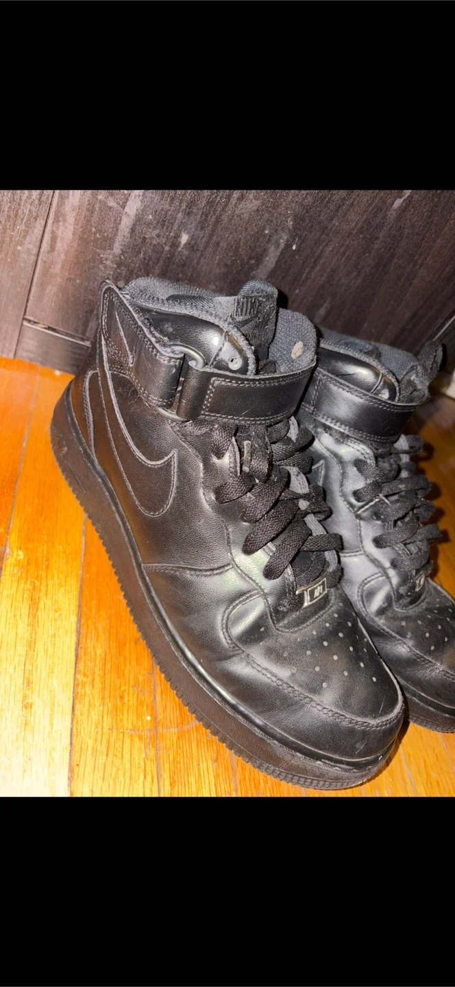 These are a pair of black Nike Air Force 1 high top sneakers. They're made of leather with a rubber sole. These sneakers are great for everyday wear. will be cleaned + new laces. Size 8 men