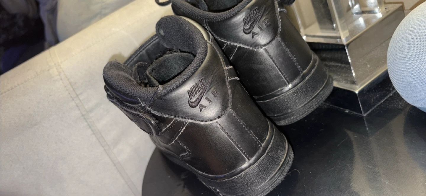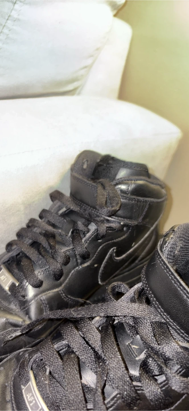 These are a pair of black Nike Air Force 1 Mid ‘07 top sneakers. They're made of leather with a rubber sole. These sneakers are great for everyday wear. will be cleaned + new laces. (Men’s 8.)