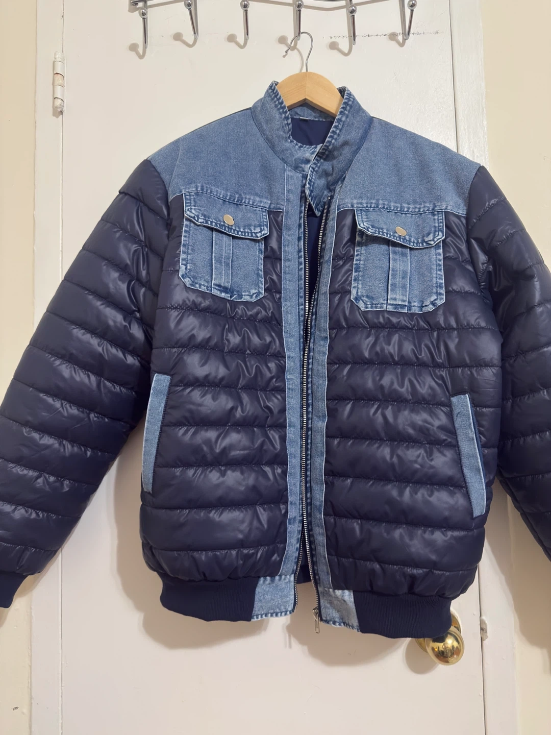 Here's a stylish navy blue puffer jacket with denim accents! It's in great condition and ready to keep you warm. The denim detailing adds a unique touch to this classic puffer style.