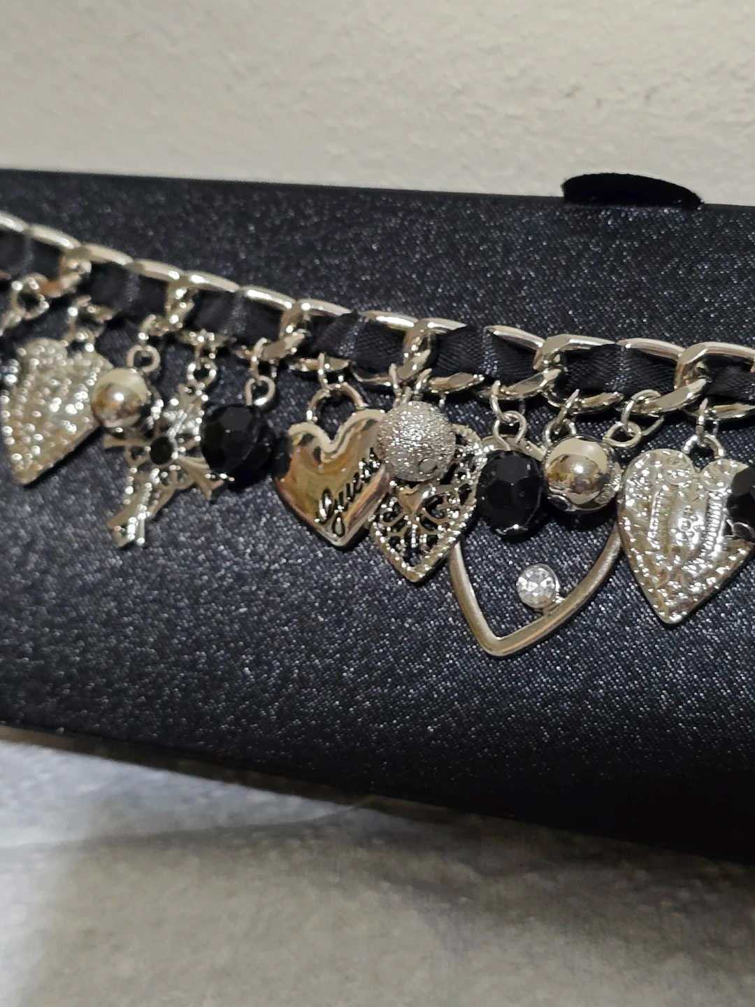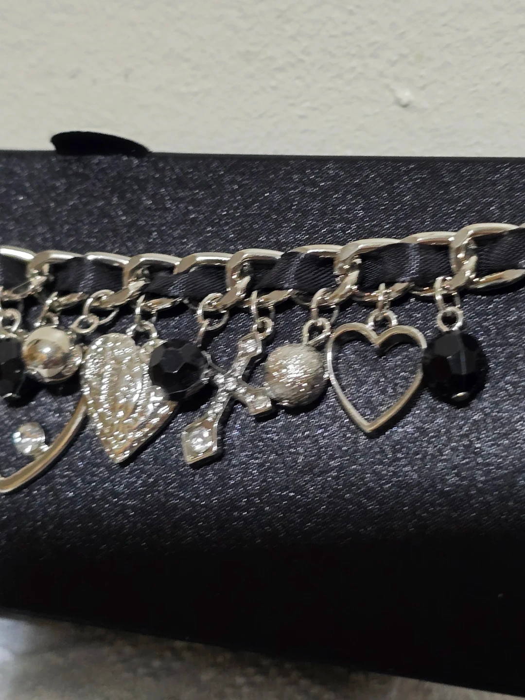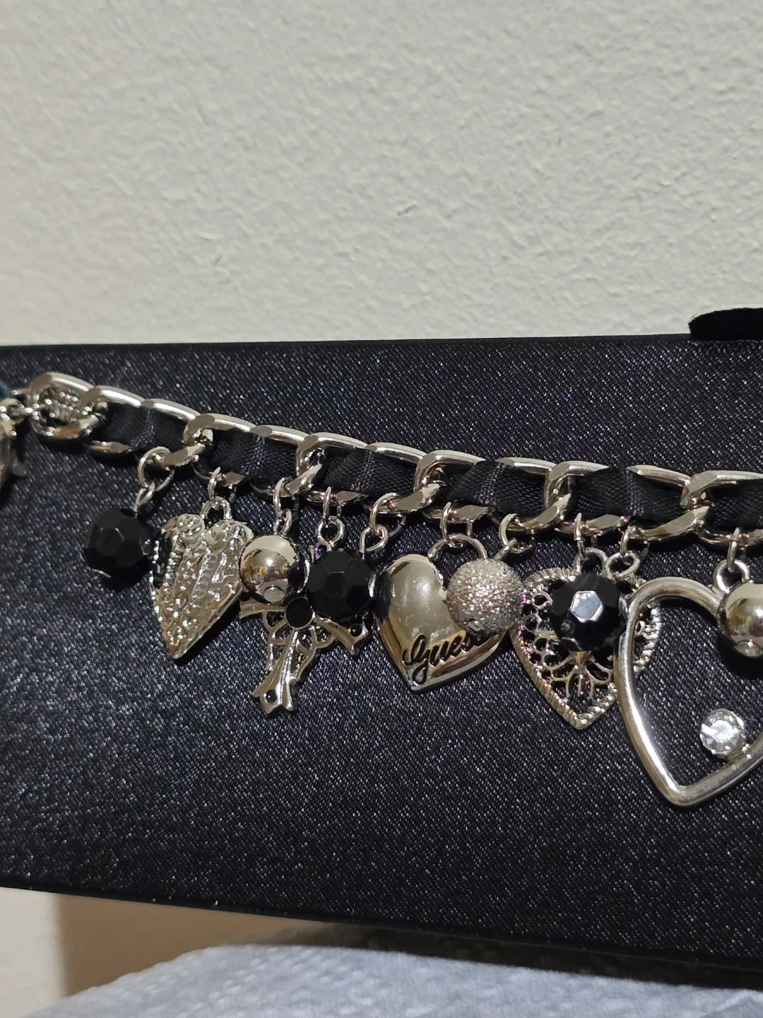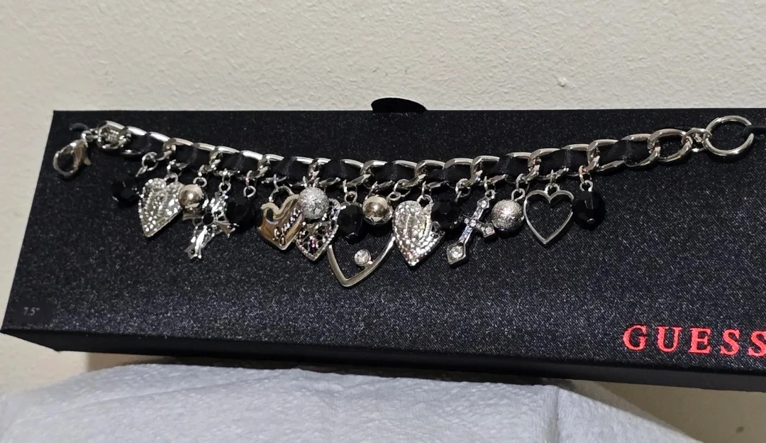 Guess Charm Bracelet Silver Tone Black Beads Hearts Cross