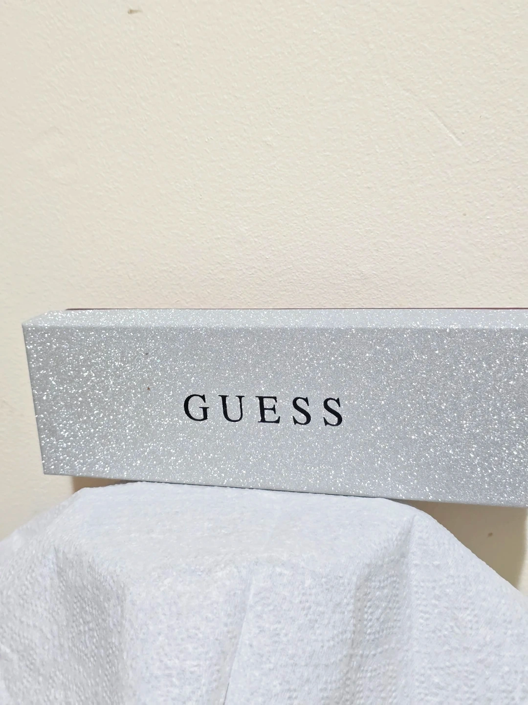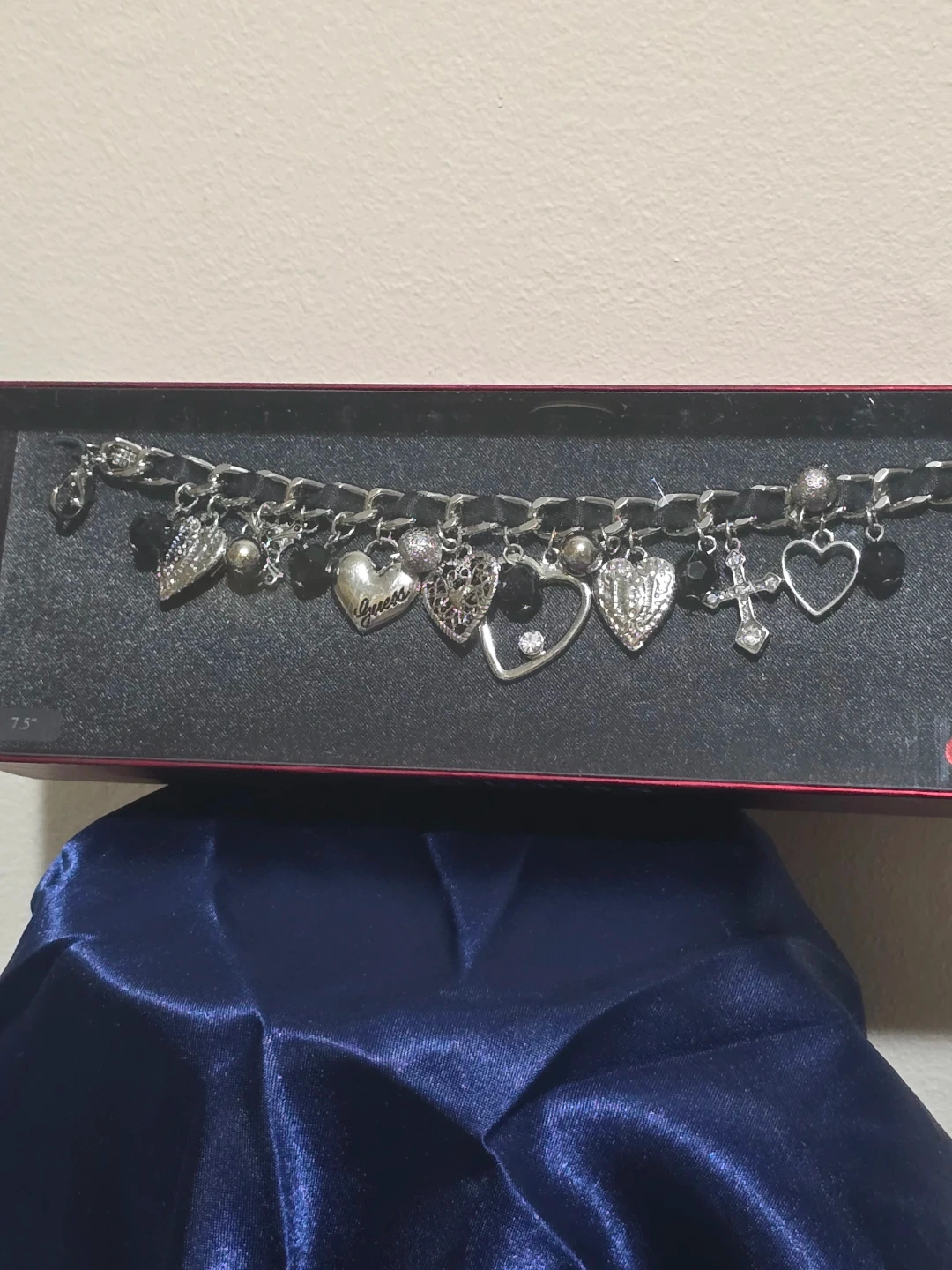 This Guess bracelet features a silver-tone chain with black beads and various charms, including hearts, a cross, and decorative pendants. It's secured with a lobster clasp closure. The box indicates a size of 7.5".