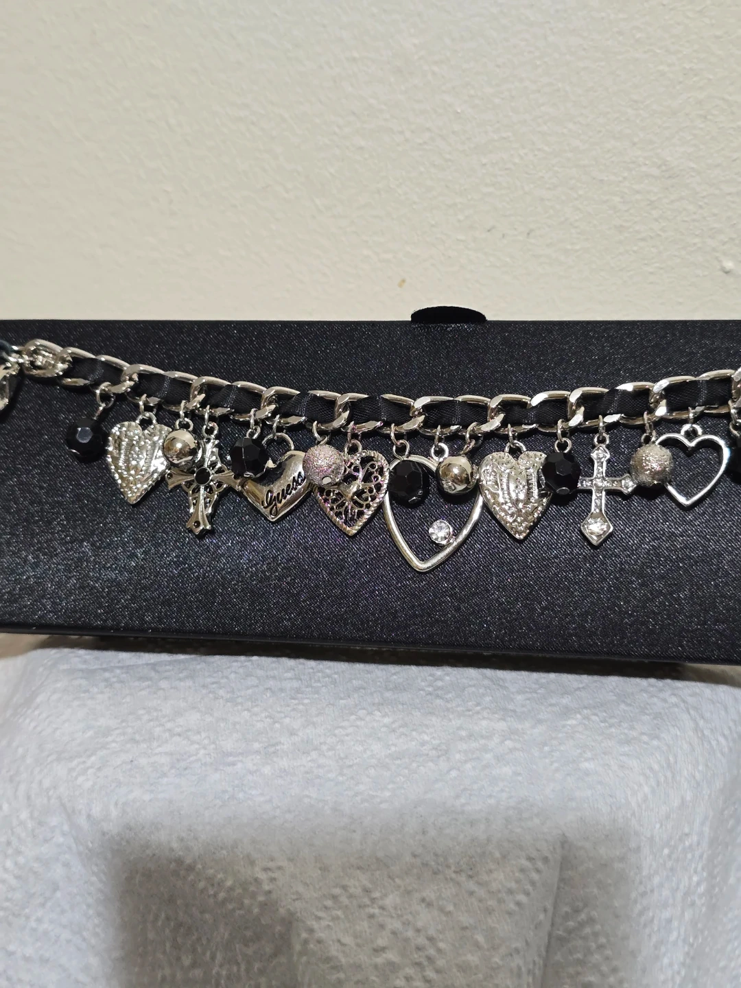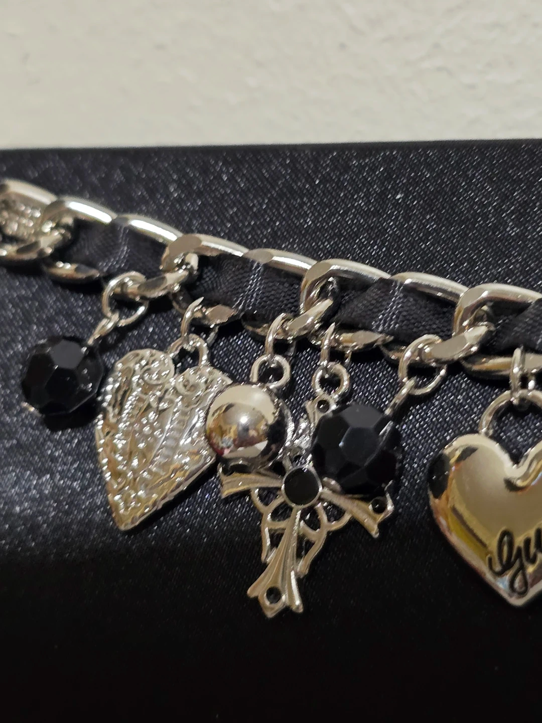 Guess Charm Bracelet Silver Tone Black Beads Hearts Cross