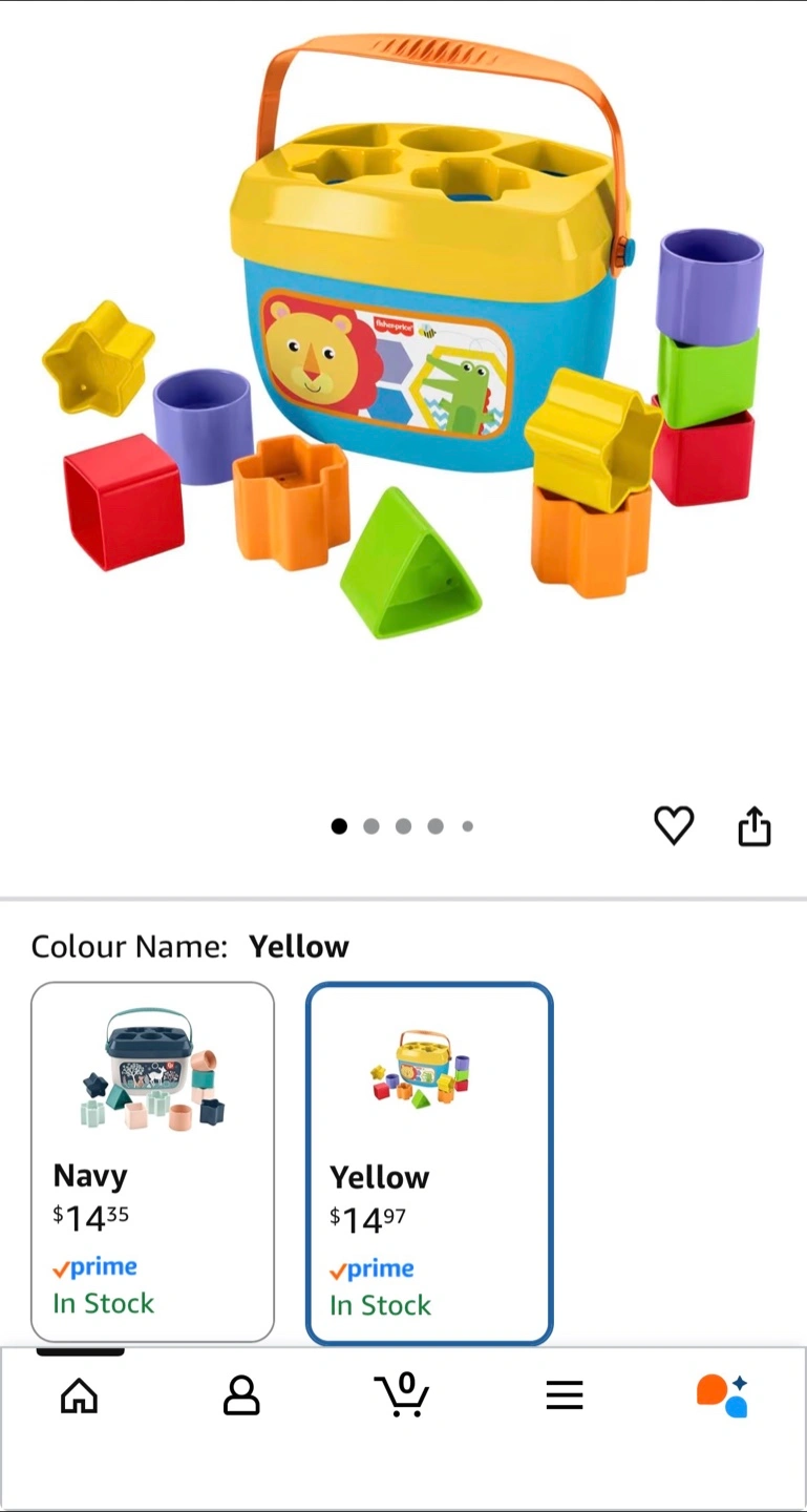Fisher-Price Stacking Toy Baby’s First Blocks Set of 10 Shapes for Sorting Play for Infants Ages 6+ Months (https://a.co/d/0dAmTqI6) - Store price: 14.97
