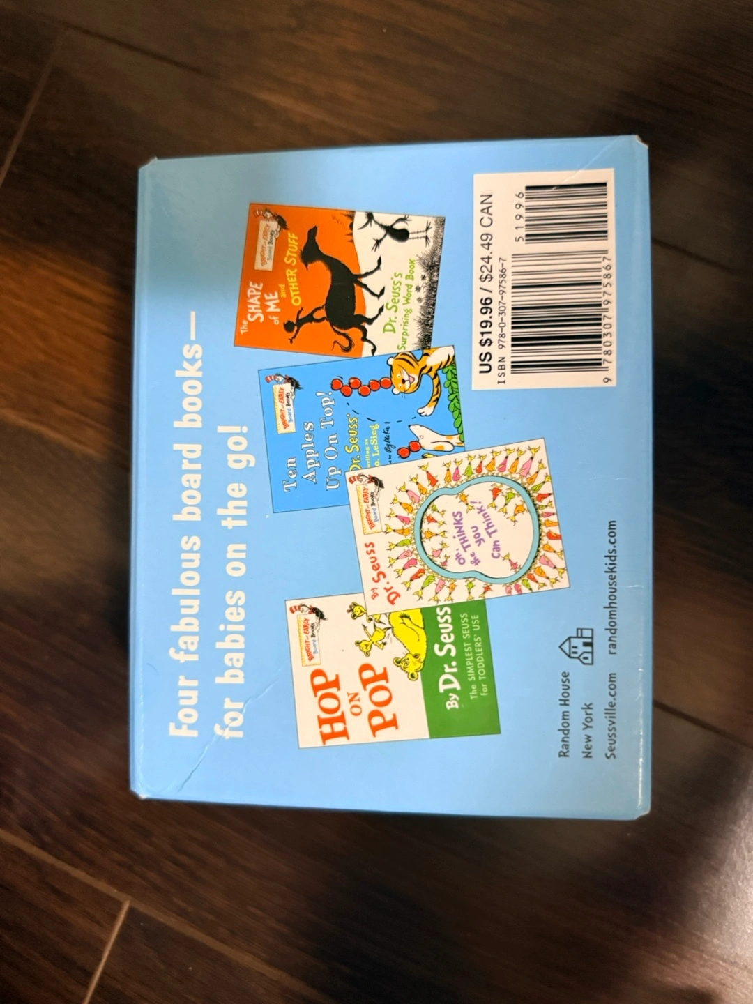 The Little Blue Boxed Set of 4 Bright and Early Board Books: Hop on Pop; Oh, the Thinks You Can Think!; Ten Apples Up On Top!; The Shape of Me and Other Stuff (https://a.co/d/0iDxI5va)