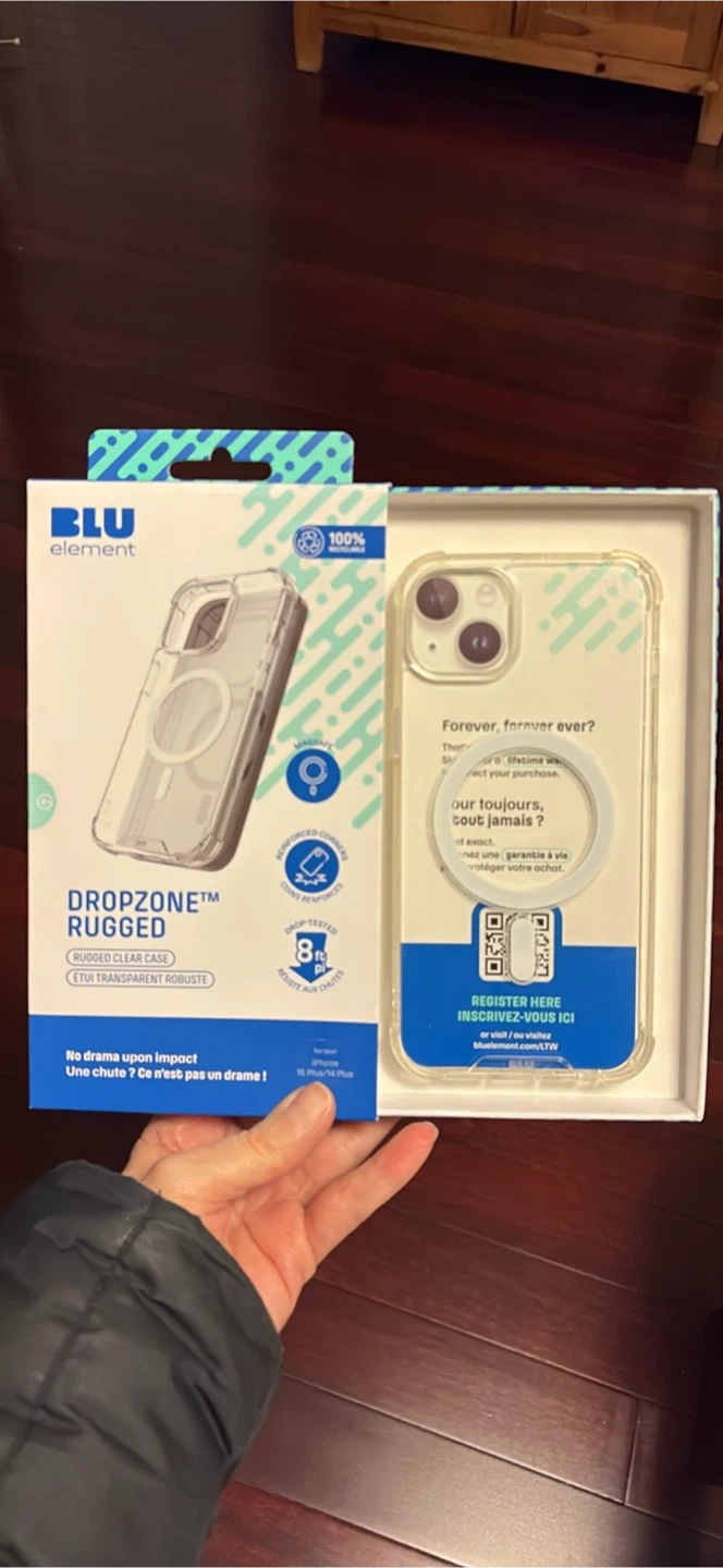 This is a Blu Element Dropzone Rugged clear case designed for the iPhone 15 Plus/14 Plus. It's made from a shock-absorbing TPU and polycarbonate material with reinforced corners for extra protection. The case is drop-tested to withstand up to 8 feet and offers anti-scratch and full port access. It's also MagSafe compatible!