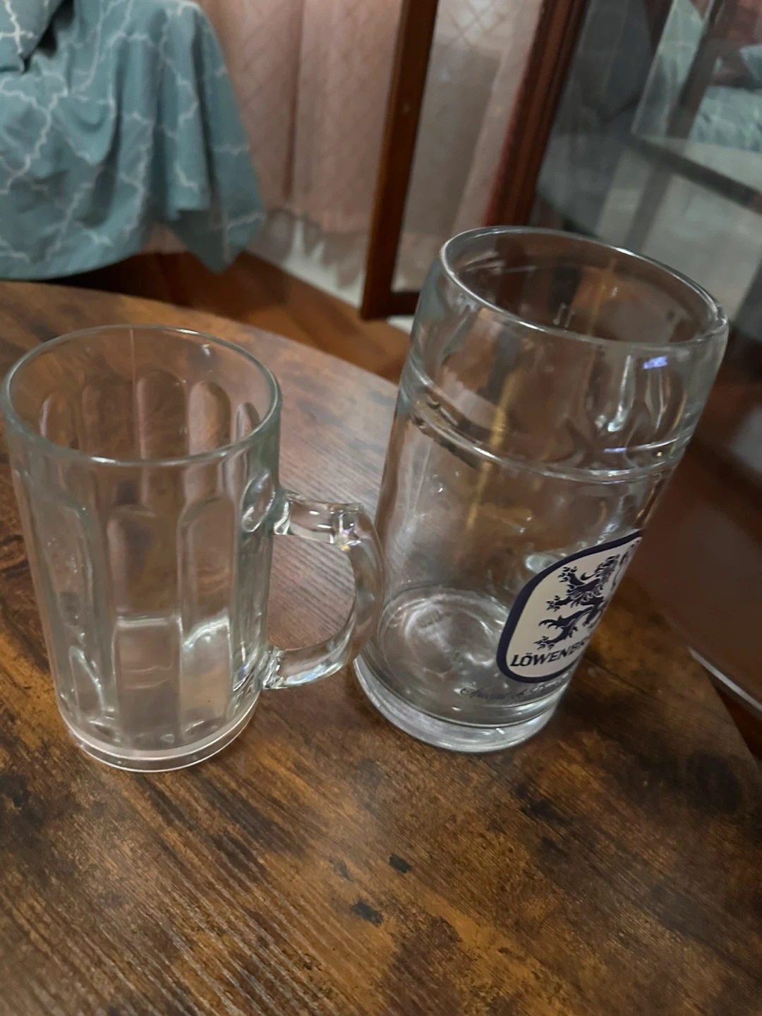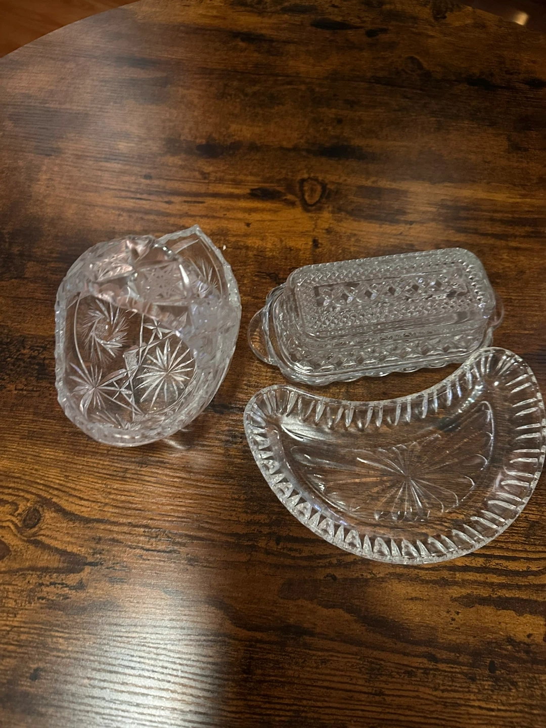 This lot includes a variety of glass serving dishes, including a large footed bowl, a butter dish, and smaller decorative dishes. Also includes two glass mugs, one with a handle and another larger stein-style mug. Glass construction. Perfect for serving snacks or beverages!