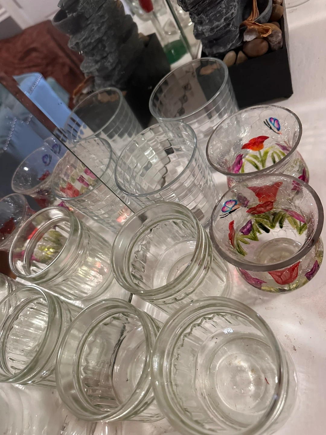 This lot includes a variety of glass serving dishes, including a large footed bowl, a butter dish, and smaller decorative dishes. Also includes two glass mugs, one with a handle and another larger stein-style mug. Glass construction. Perfect for serving snacks or beverages!