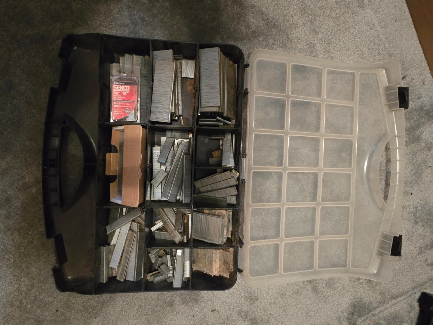 A large organizer case filled with a variety of Senco brand staples. It's divided into many compartments to keep different sizes sorted. A clear lid closes securely to keep everything contained. Great for any professional or DIYer needing a wide selection of fasteners!