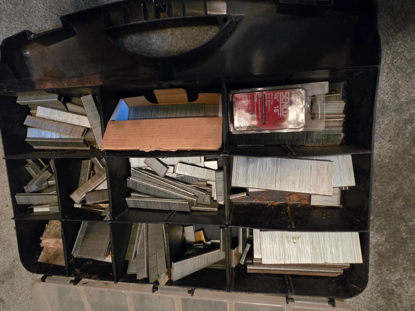 A large organizer case filled with a variety of Senco brand staples. It's divided into many compartments to keep different sizes sorted. A clear lid closes securely to keep everything contained. Great for any professional or DIYer needing a wide selection of fasteners!
