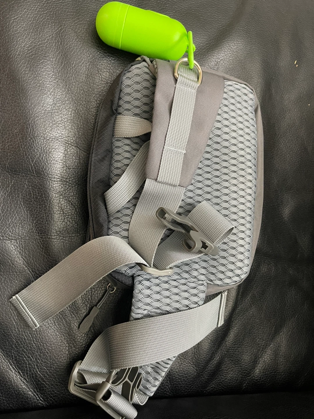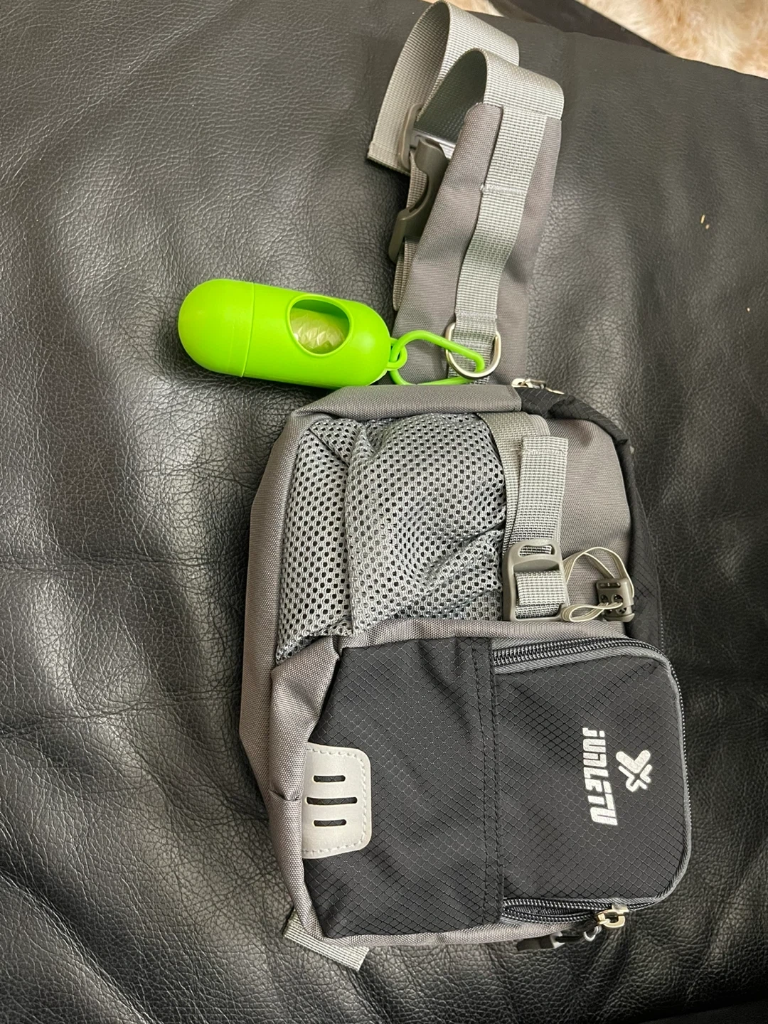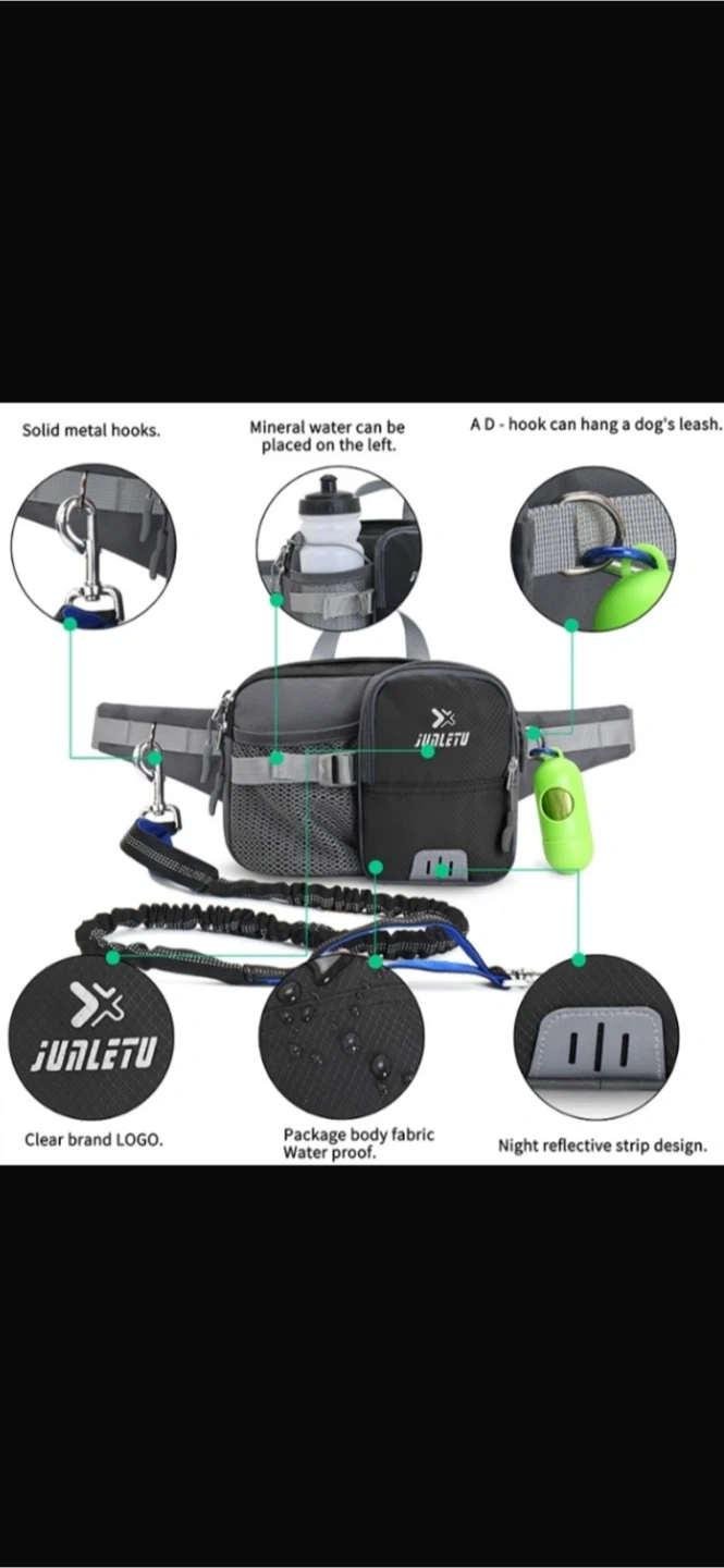 This dog walking bag is waterproof with a night reflective strip design. It includes solid metal hooks and a D-ring to hang a dog's leash. Mineral water can be placed on left side pocket.