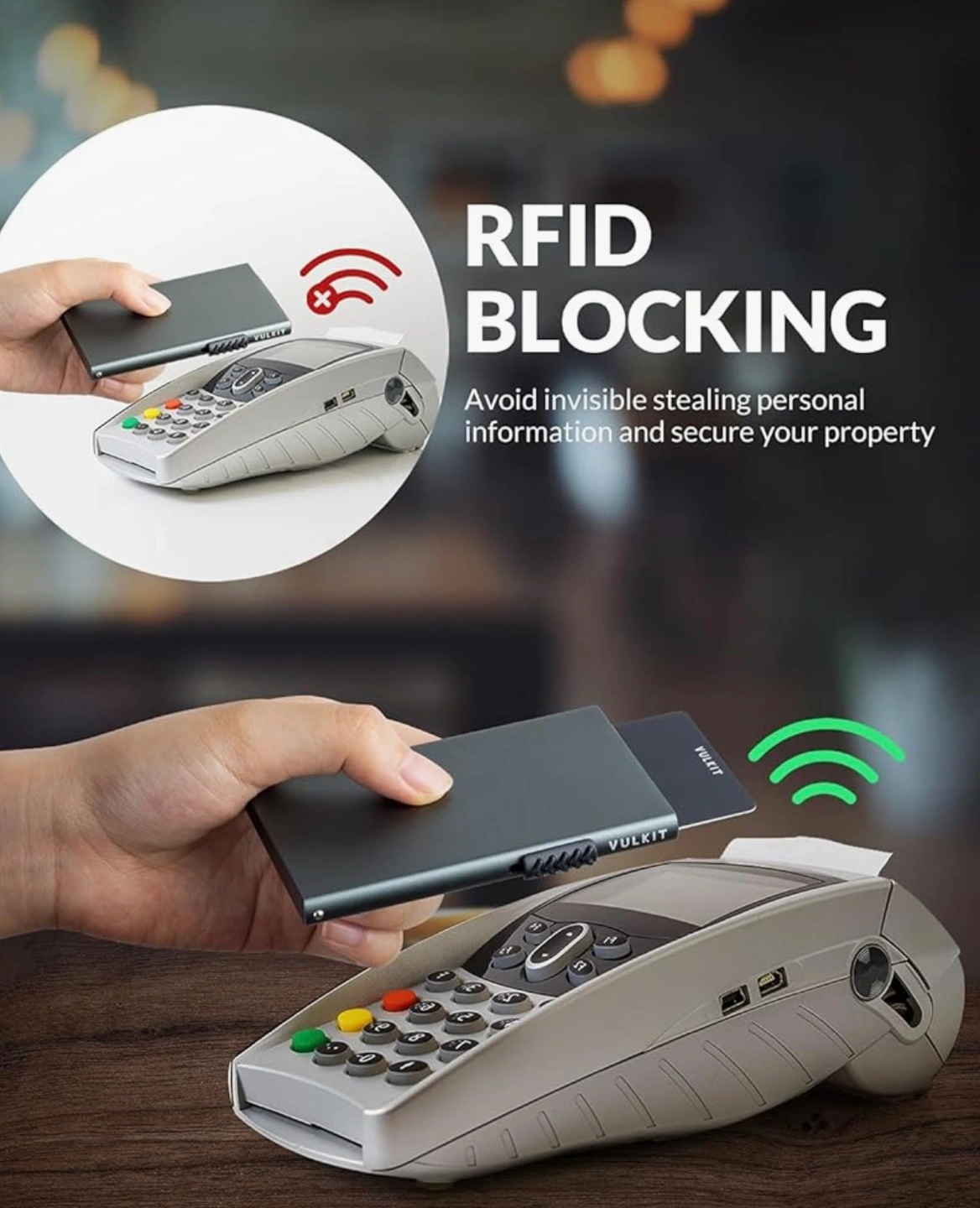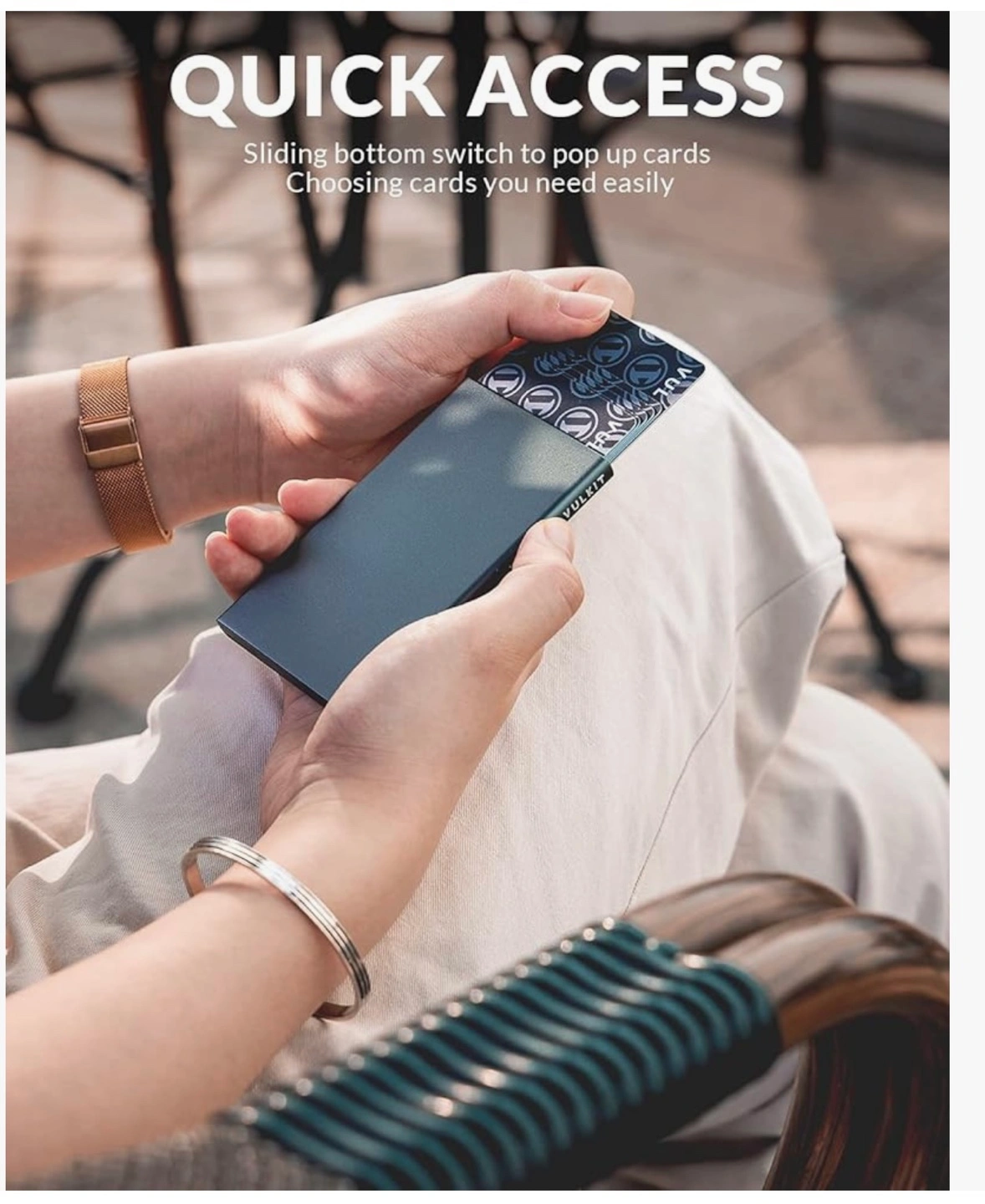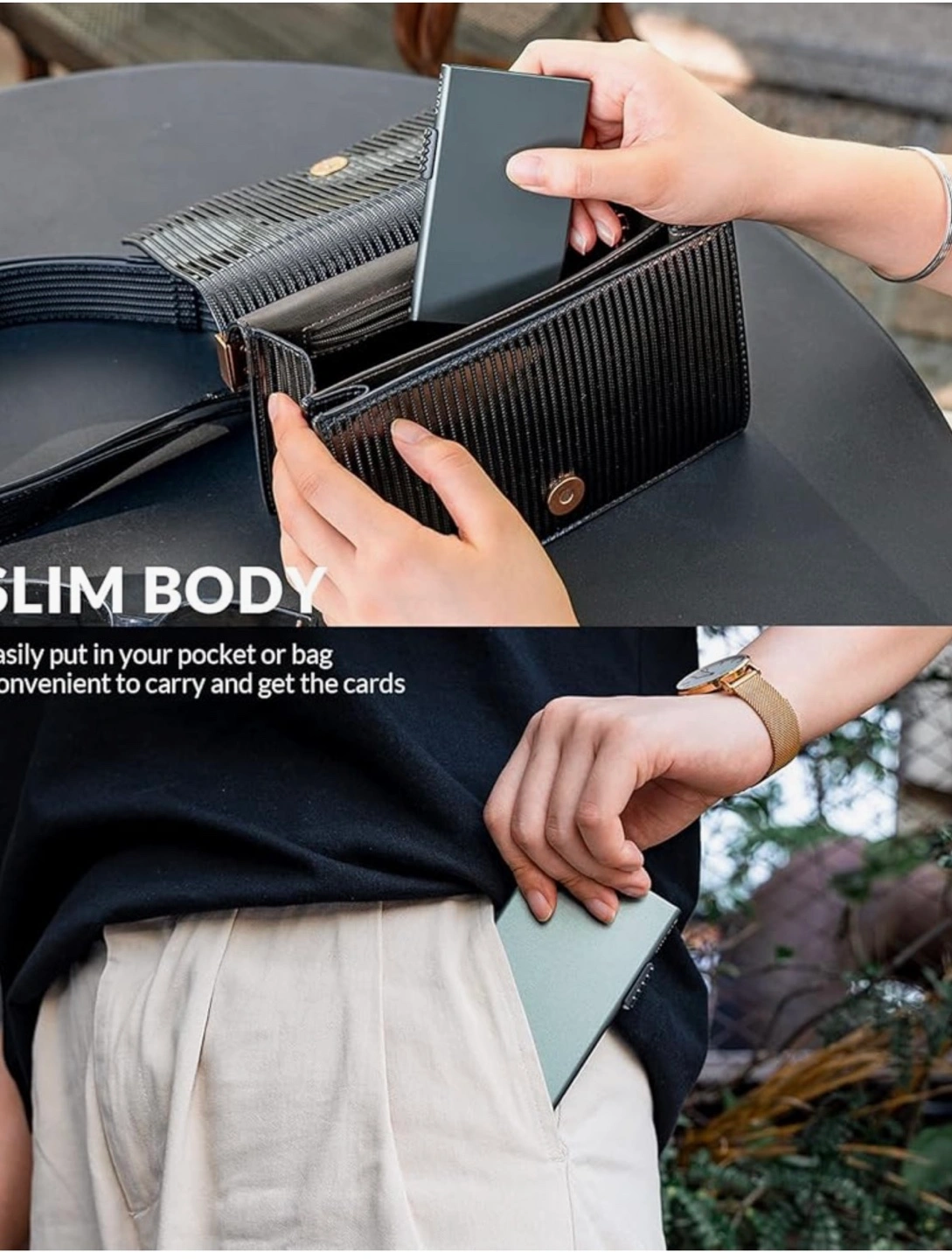 Slim and sleek aluminium card holder. Holds multiple cards. RFID blocking technology protects your information. Easy access to cards. Convenient for pocket or bag.