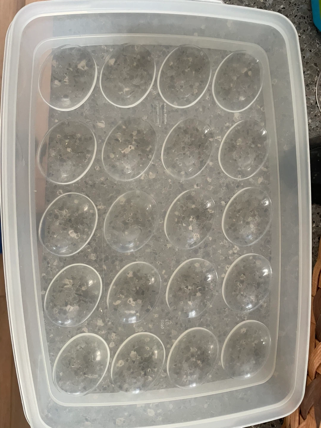 Two ice cube trays and an egg container. Includes one blue rectangular tray and one clear egg tray. Made by Rubbermaid.