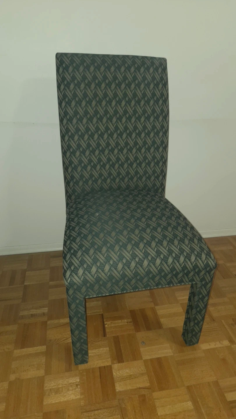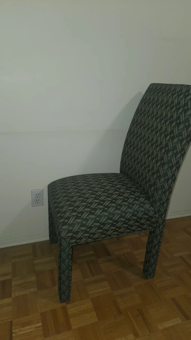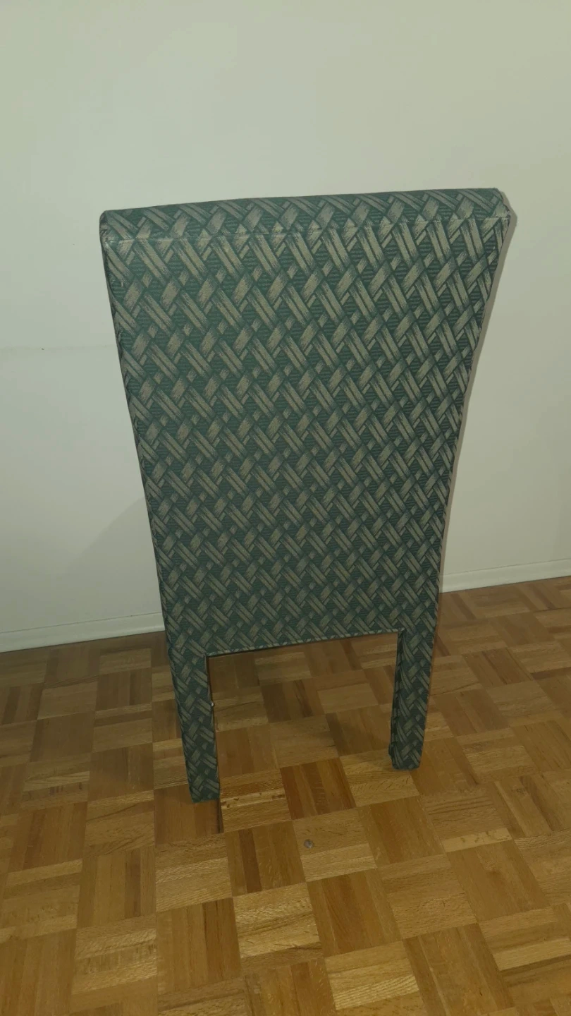 A set of 4 upholstered dining chair with a woven green and beige patterned fabric. The chair has a curved back and four sturdy legs.