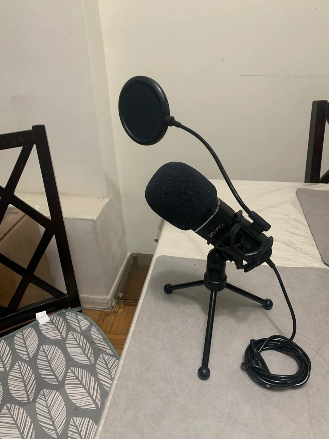 This Yenmai USB microphone kit is designed for clear audio recording. It comes with a shock mount and pop filter for better sound quality. The microphone includes a tripod stand for easy placement.