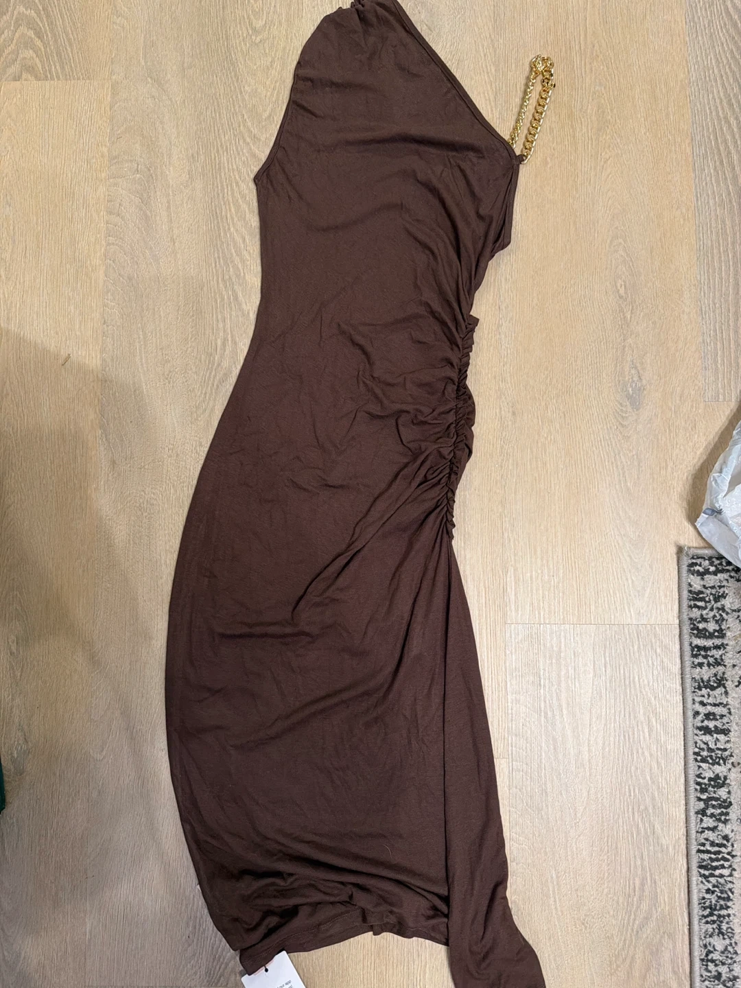 Here's a stylish MICAS dress in a lovely brown colour. It features a unique one-shoulder design and a chic gold chain detail. Perfect for adding a touch of elegance to your wardrobe!