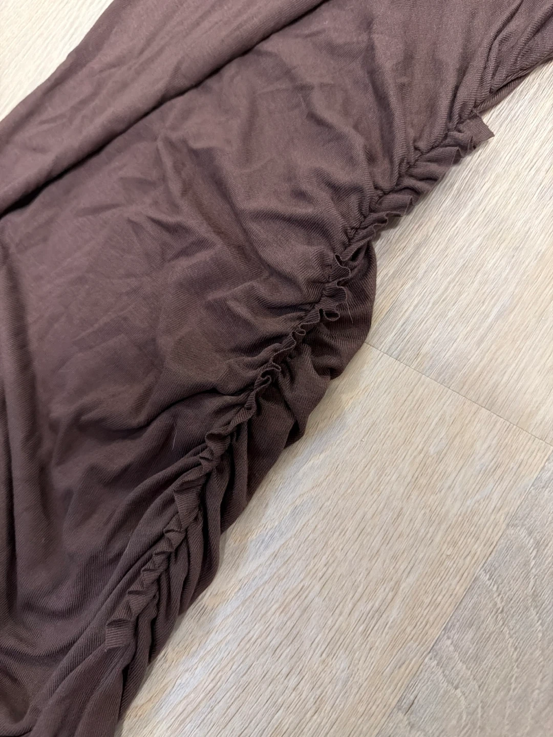 Here's a stylish MICAS dress in a lovely brown colour. It features a unique one-shoulder design and a chic gold chain detail. Perfect for adding a touch of elegance to your wardrobe!