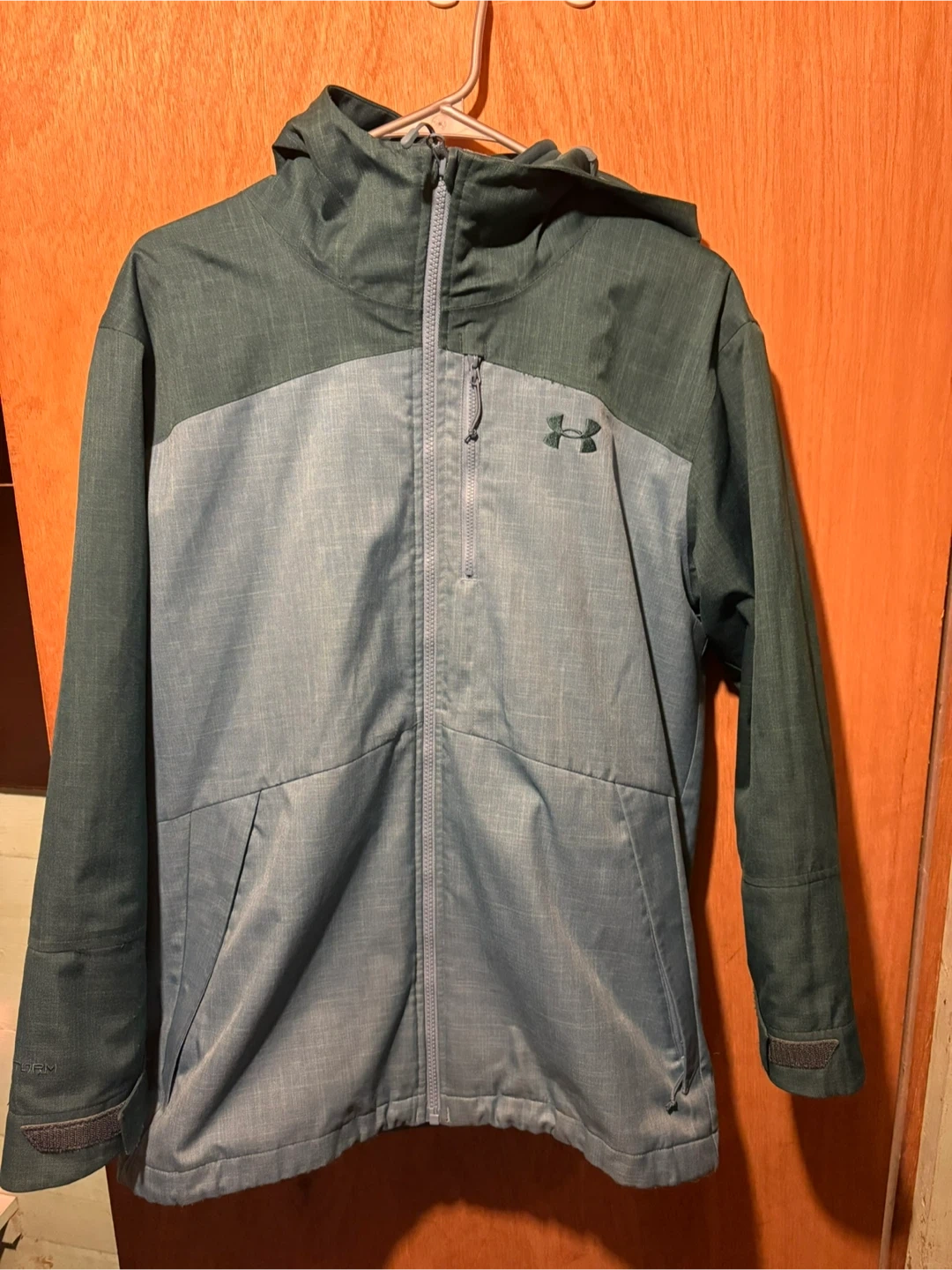 This Under Armour jacket has a full zip front and a hood. It features two exterior pockets and adjustable cuffs. It's suitable for cooler weather activities.