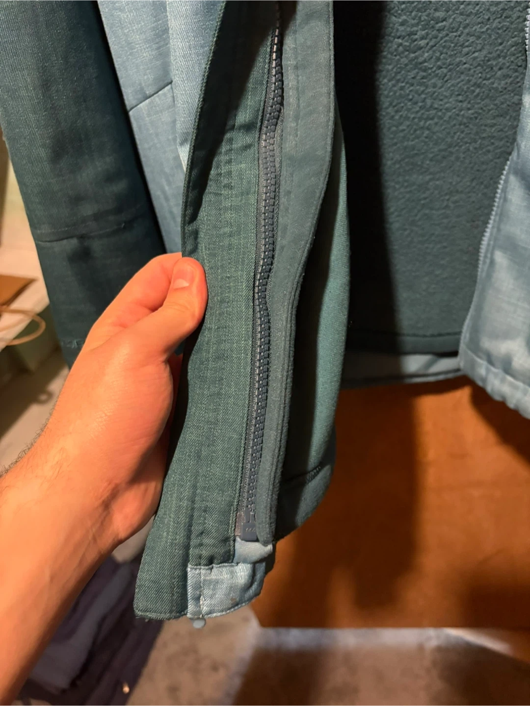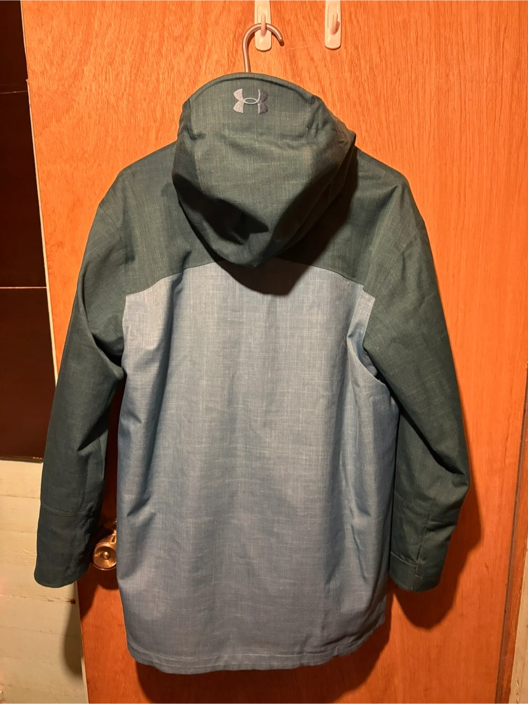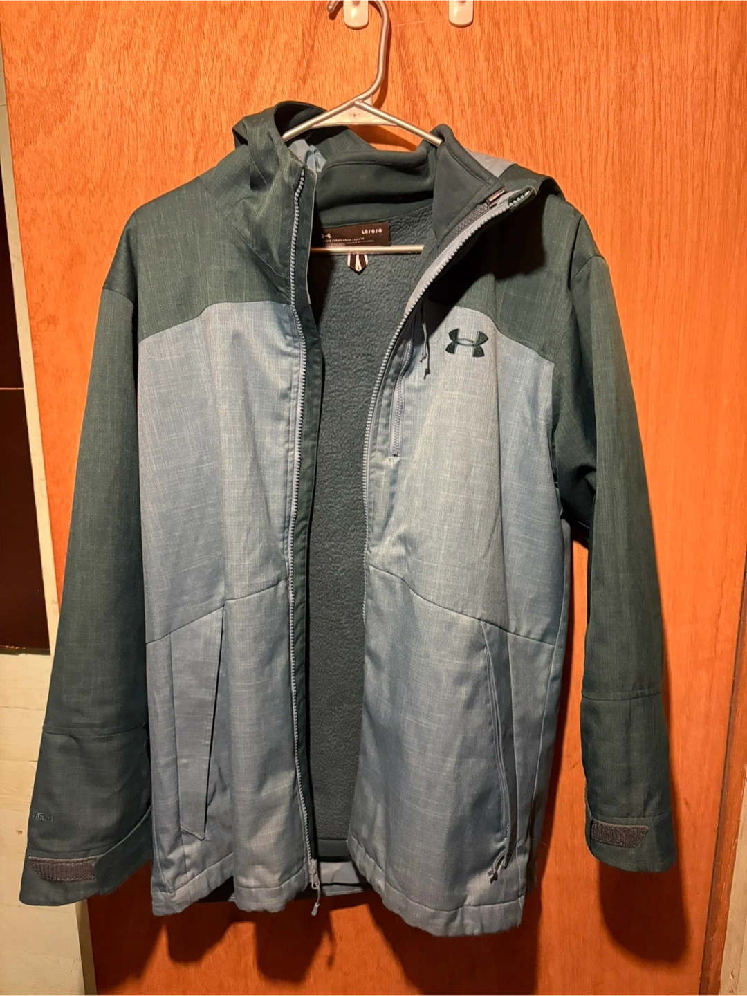 This Under Armour jacket has a full zip front and a hood. It features two exterior pockets and adjustable cuffs. It's suitable for cooler weather activities.