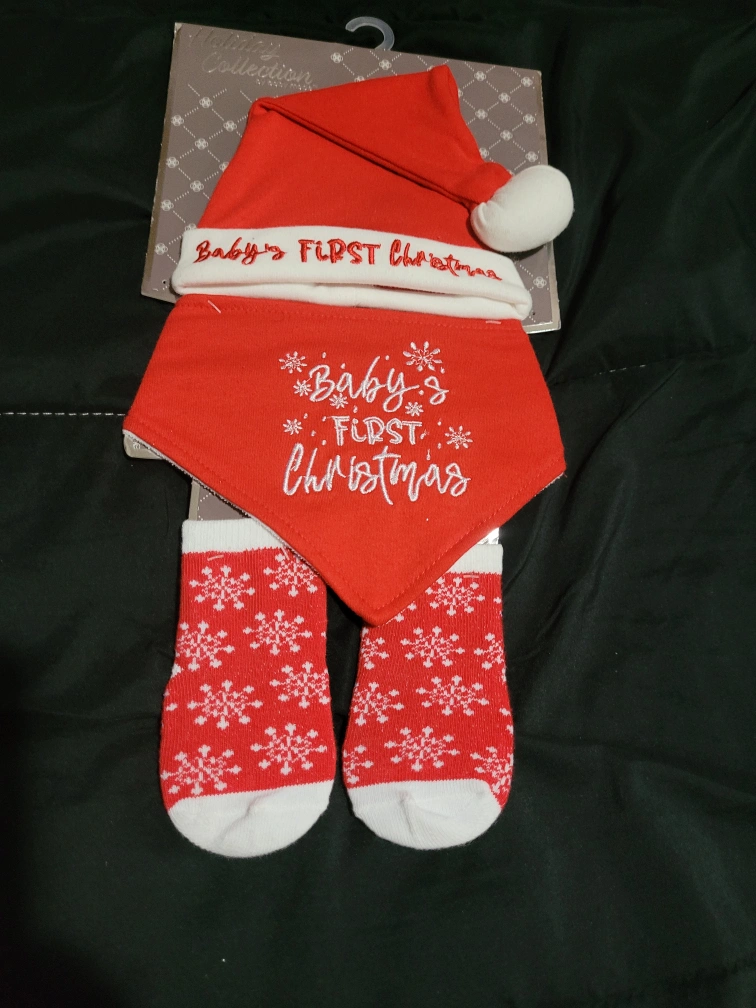 Get ready for the holidays with this adorable "Baby's First Christmas" set! It includes a cute Santa hat, a matching bib, and a pair of festive socks, all brand new with tags. Perfect for those first Christmas photos!