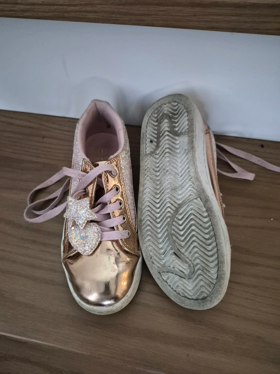 These cute girls' sneakers are size 1 and feature a sparkly rose gold colour. They have a star and heart design on the laces. They show some signs of wear, but still have lots of life left in them!