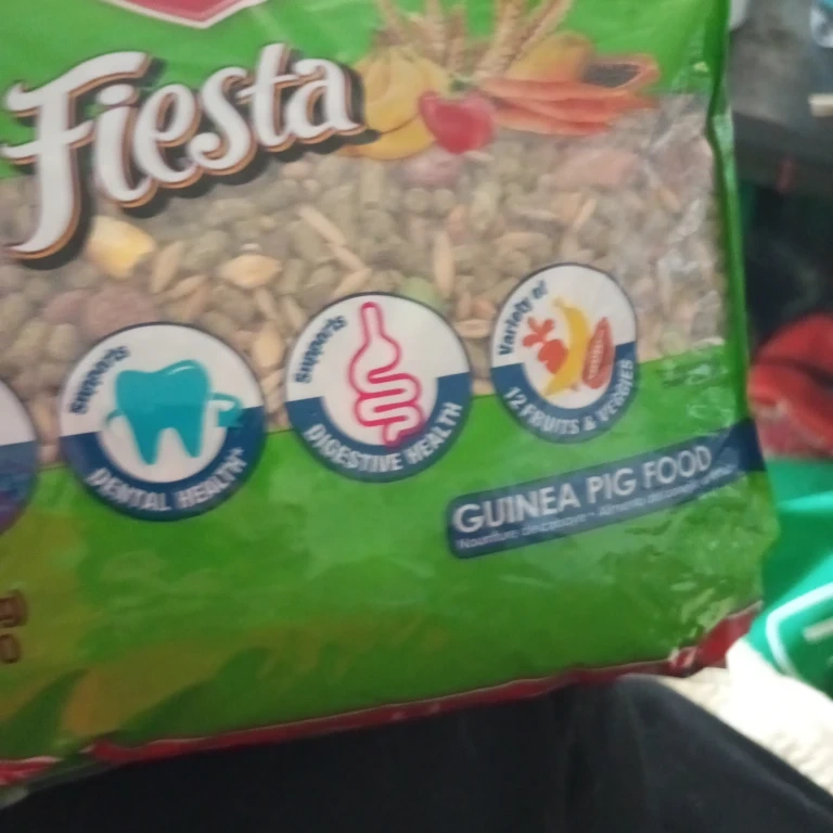 This Kaytee Fiesta food is specifically formulated for guinea pigs. It supports dental health and digestive health, and contains a variety of fruits and veggies. It's fortified with Vitamin C for long-lasting benefits. This is a 4.5 lb bag of guinea pig food.