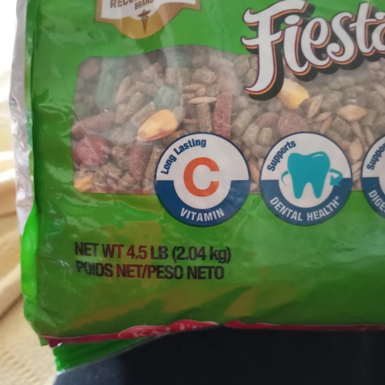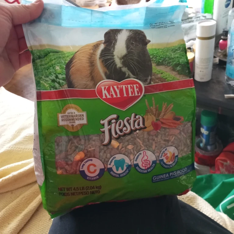 This Kaytee Fiesta food is specifically formulated for guinea pigs. It supports dental health and digestive health, and contains a variety of fruits and veggies. It's fortified with Vitamin C for long-lasting benefits. This is a 4.5 lb bag of guinea pig food.