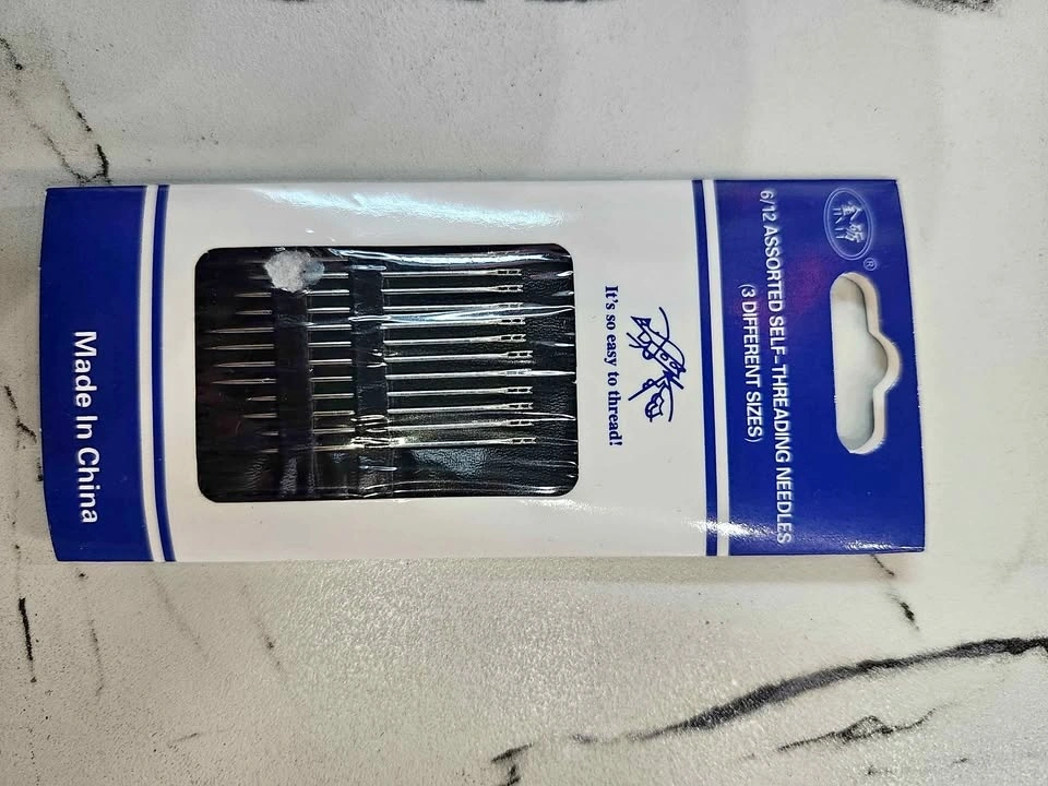 Handy pack of JINLI self-threading needles. Assorted sizes, has 3 different sizes. Super easy to thread. Made in China.